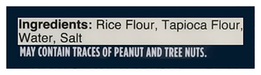 Ingredients: Rice Flour, Tapioca Flour, Water, Salt Contains: Peanuts, Tree Nuts