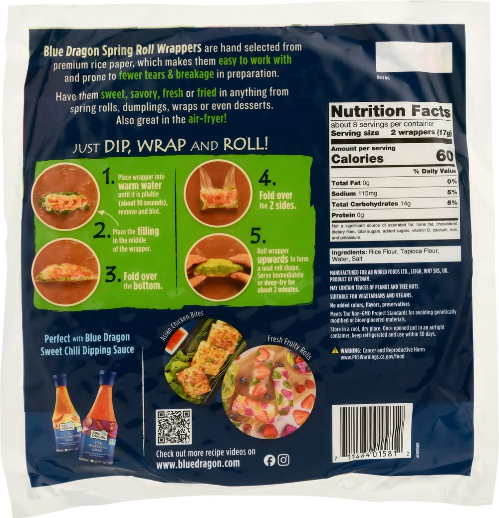 Spring Roll Wrappers • Brand: Blue dragon • gluten-free, vegan, vegetarian, GMO-free • AB World Foods Ltd, Leigh, WN7 5RS, UK
