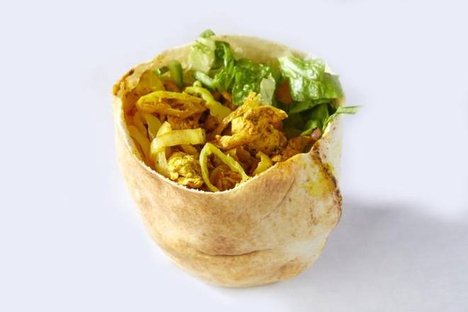 Sliced chicken kebab grilled with onions and served in a fresh pocket pita bread or Arab style wrap with fresh lettuce, tomato, and cucumbers. Served with your choice of sauce.