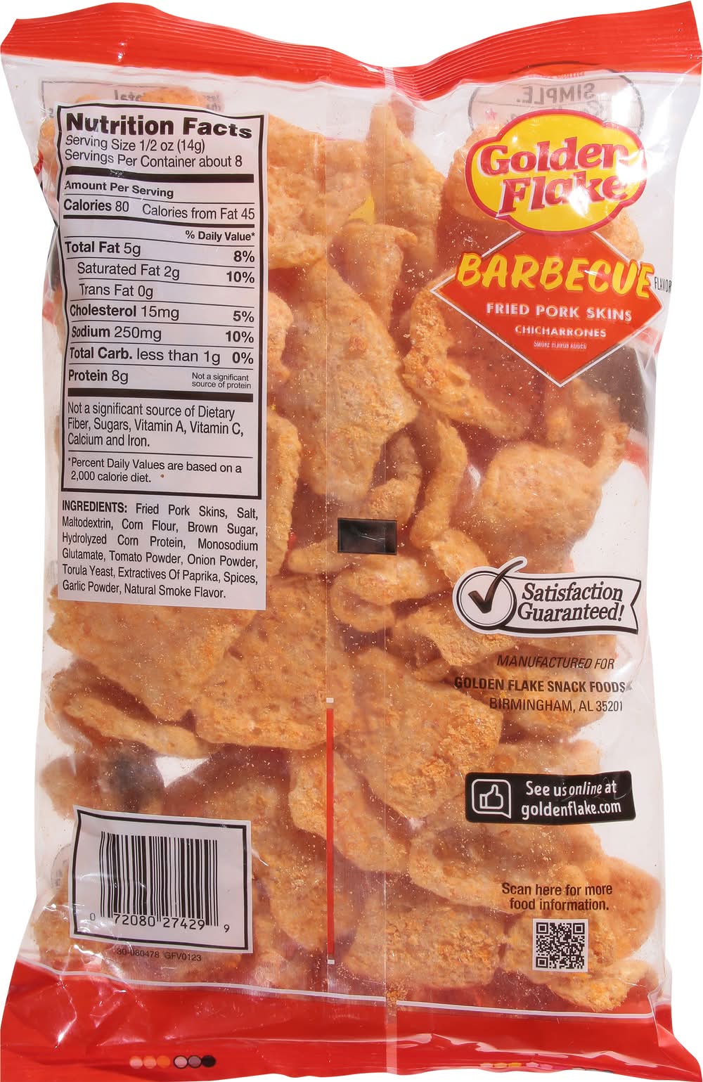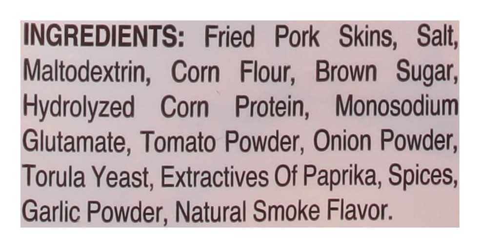 Ingredients: Fried Pork Skins, Salt, Maltodextrin, Corn Flour, Brown Sugar, Hydrolyzed Corn Protein, Monosodium Glutamate, Tomato Powder, Onion Powder, Torula Yeast, Extractives of Paprika, Spices, Garlic Powder, Natural Smoke Flavor Contains: Corn