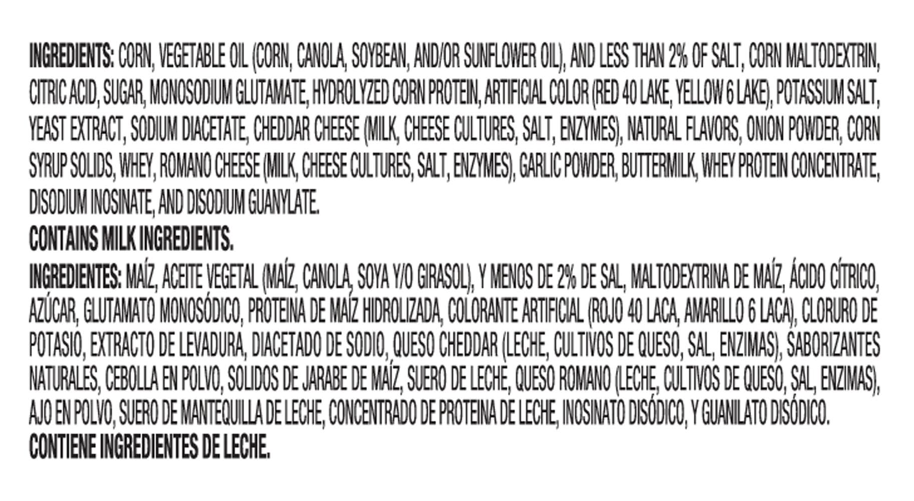 Ingredients: Corn, Vegetable Oil (Corn, Canola, Soybean, and/or Sunflower Oil), and Less than 2% of Salt, Corn Maltodextrin, Citric Acid, Sugar, Monosodium Glutamate, Hydrolyzed Corn Protein, Artificial Color (Red 40 Lake, Yellow 6 Lake), Potassium Salt, Yeast Extract, Sodium Diacetate, Cheddar Cheese (Milk, Cheese Cultures, Salt, Enzymes), Natural Flavors, Onion Powder, Corn Syrup Solids, Whey, Romano Cheese (Milk, Cheese Cultures, Salt, Enzymes), Garlic Powder, Buttermilk, Whey Protein Concentrate, Disodium Inosinate, and Disodium Guanylate Contains: Soybeans, Milk