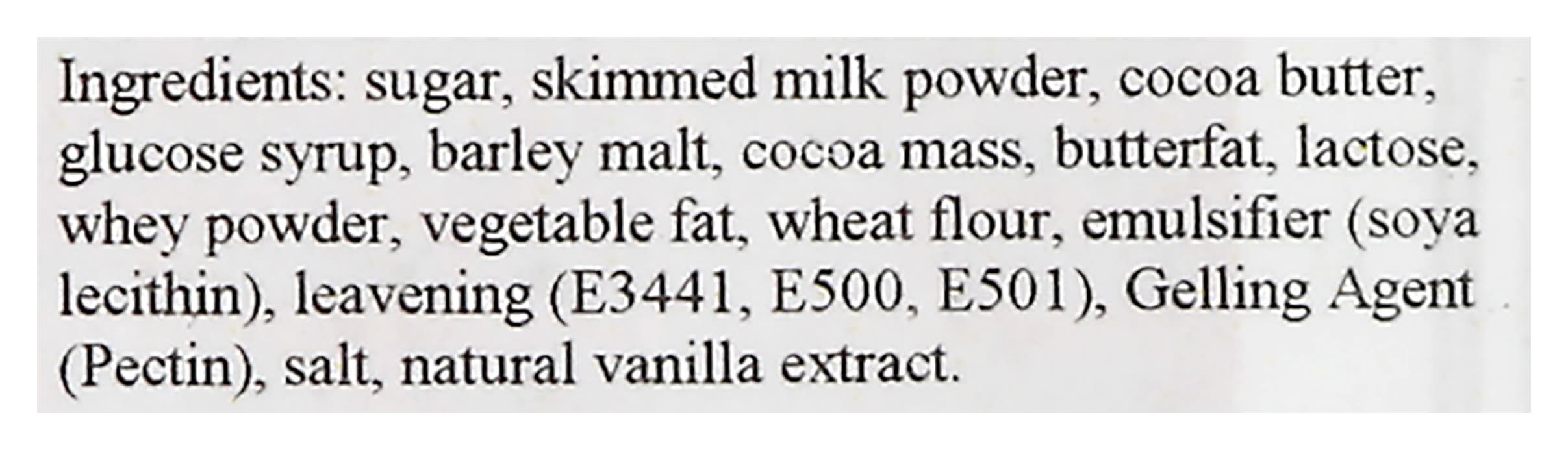 Ingredients: Sugar, Skimmed Milk Powder, Cocoa Butter, Glucose Syrup, Barley Malt, Cocoa Mass, Butterfat, Lactose, Whey Powder, Vegetable Fat, Wheat Flour, Emulsifier (Soya Lecithin), Leavening (E3441, E500, E501), Gelling Agent (Pectin), Salt, Natural Vanilla Extract Contains: Soybeans, Milk, Lactose, Wheat, Tree Nuts