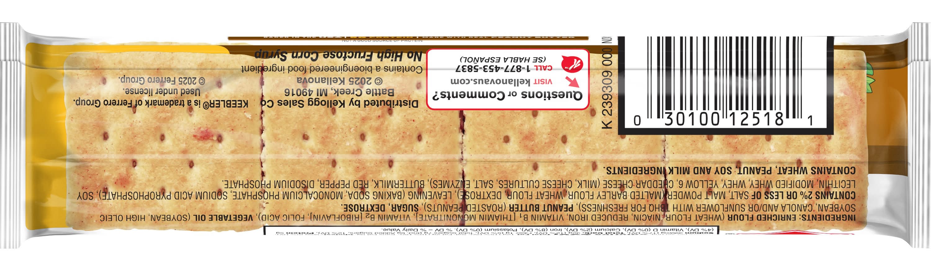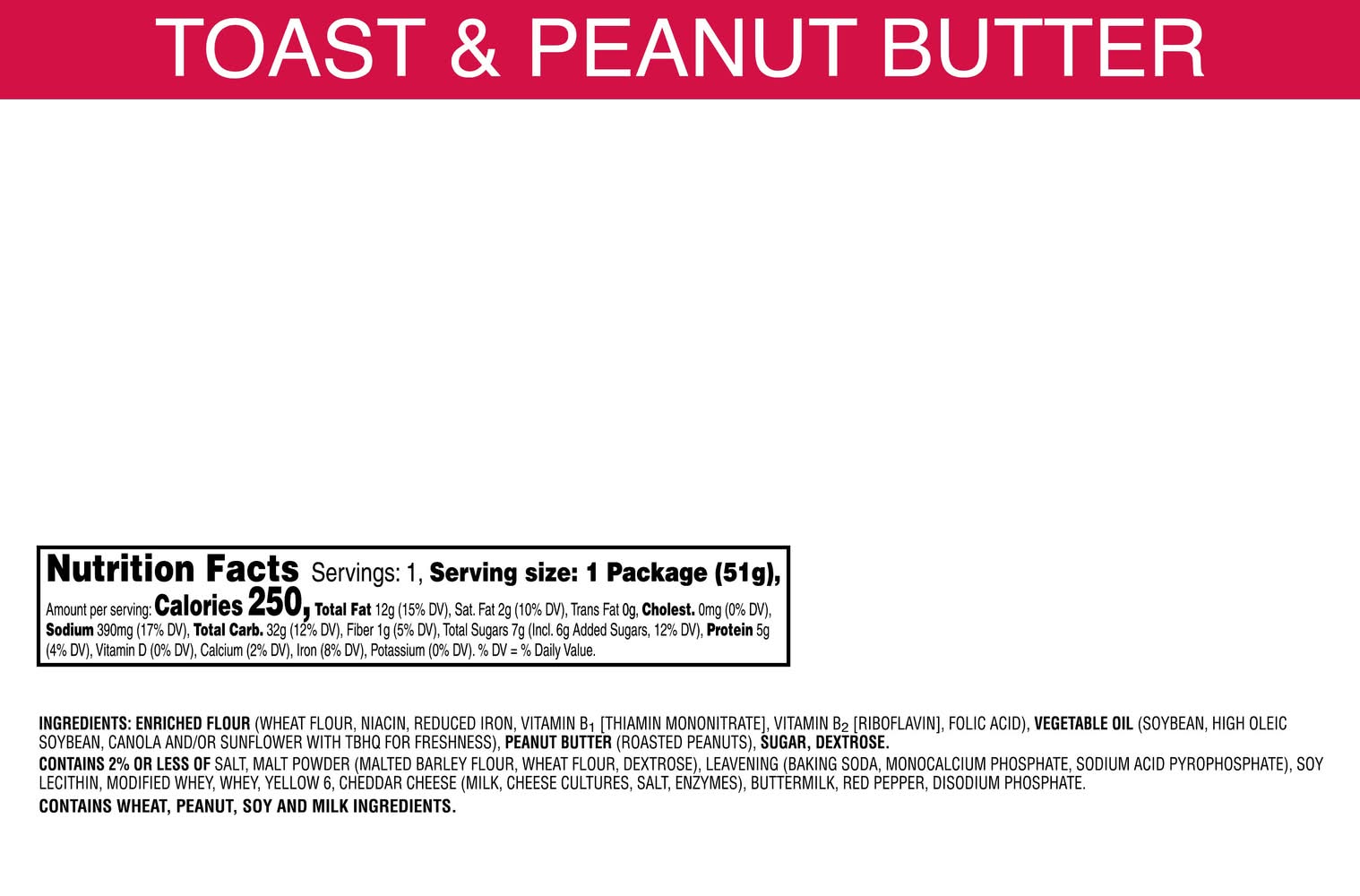 Ingredients: Enriched Flour (Wheat Flour, Niacin, Reduced Iron, Vitamin B1 [Thiamin Mononitrate], Vitamin B2 [Riboflavin], Folic Acid), Vegetable Oil (Soybean, High Oleic Soybean, Canola And/Or Sunflower With Tbhq For Freshness), Peanut Butter (Roasted Peanuts), Sugar, Dextrose. Contains 2% Or Less Of Salt, Malt Powder (Malted Barley Flour, Wheat Flour, Dextrose), Leavening (Baking Soda, Monocalcium Phosphate, Sodium Acid Pyrophosphate), Soy Lecithin, Modified Whey, Whey, Yellow 6, Cheddar Cheese (Milk, Cheese Cultures, Salt, Enzymes), Buttermilk, Red Pepper, Disodium Phosphate. Contains: Milk, Peanuts, Soybeans, Wheat