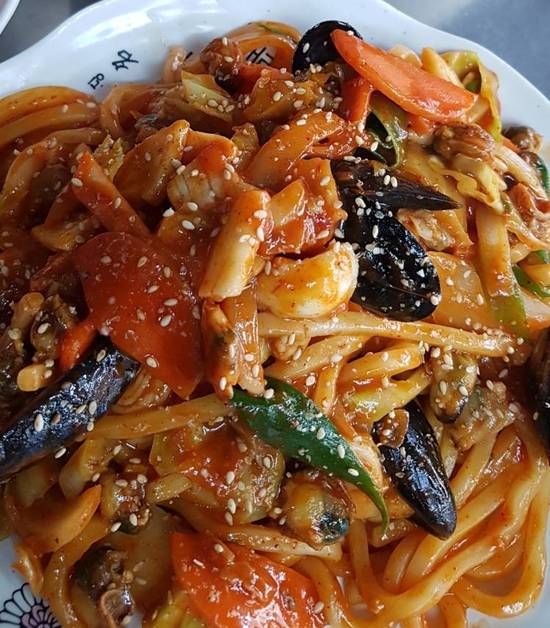 STIR FRIED SPICY SEAFOOD W/UDON NOODLE