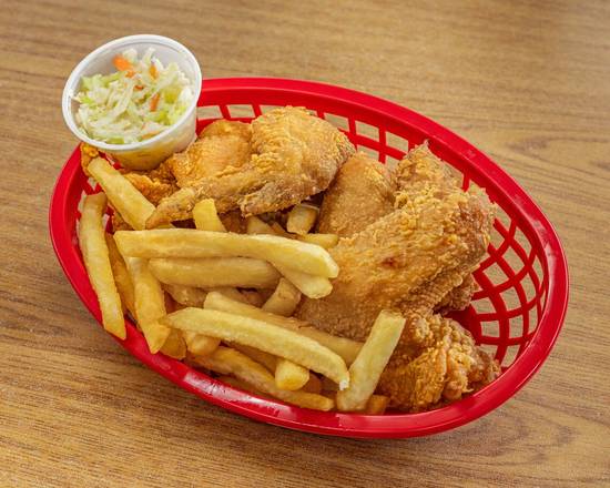 4pc Whole Wings Dinner. Served with Fries and Bread. Add your favorite flavor: Hook's Catch Sauce, Sweet a& Sour, Honey BBQ, Honey Gold)