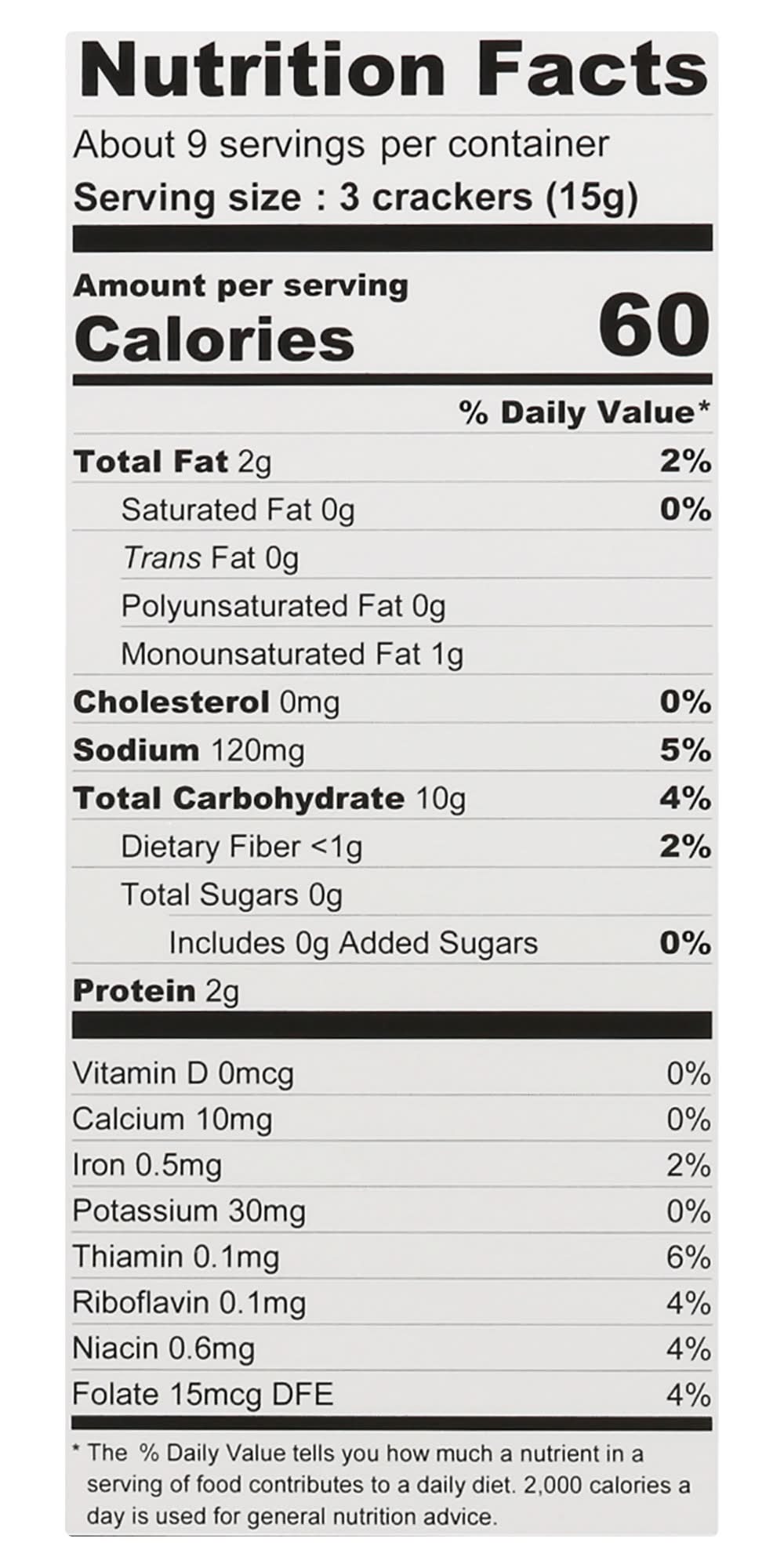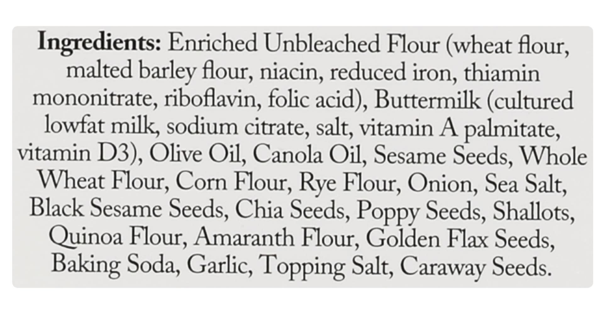 Ingredients: Enriched Unbleached Flour (Wheat Flour, Malted Barley Flour, Niacin, Reduced Iron, Thiamin Mononitrate, Riboflavin, Folic Acid), Buttermilk (Cultured Lowfat Milk, Sodium Citrate, Salt, Vitamin A Palmitate Vitamin D3), Olive Oil, Canola Oil, Sesame Seeds, Whole Wheat Flour, Corn Flour, Rye Flour, Onion, Sea Salt, Black Sesame Seeds, Chia Seeds, Poppy Seeds, Shallots, Quinoa Flour, Amaranth Flour, Golden Flax Seeds, Baking Soda, Garlic, Topping Salt, Caraway Seeds. Contains: Milk, Wheat, Sesame