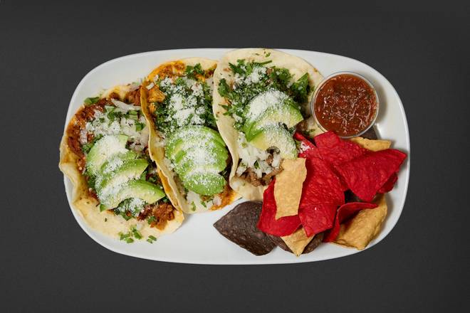 3 soft flour tortillas, onions, cilantro, avocado, and grated Cotija served with chips. Choice of asada, chicken, pork, or breaded cod.