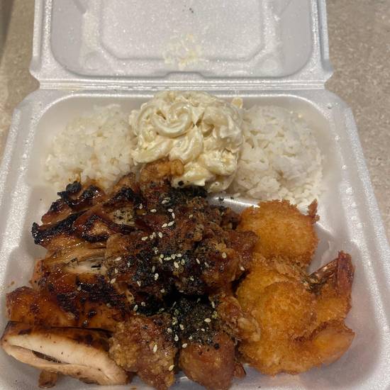 Big boi combo comes with bbq chicken, panko shrimp, furikake chicken served with yum-yum sauce.