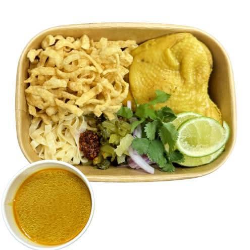 Poached bone-in chicken in Khao Soi curry. Served with egg noodles and Thai crispy noodles with pickled green mustard, cilantro, lime, red onion, and a drizzle of roasted chili oil
