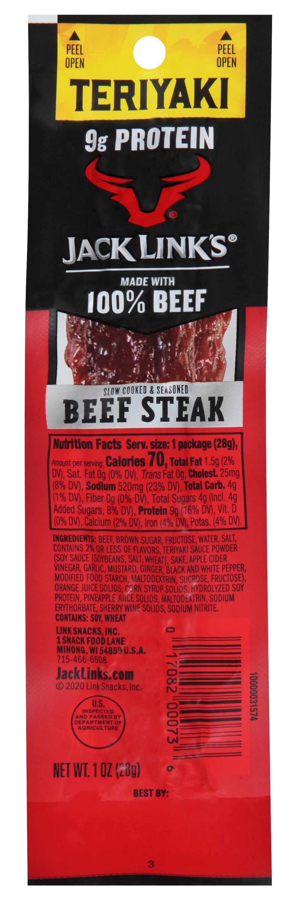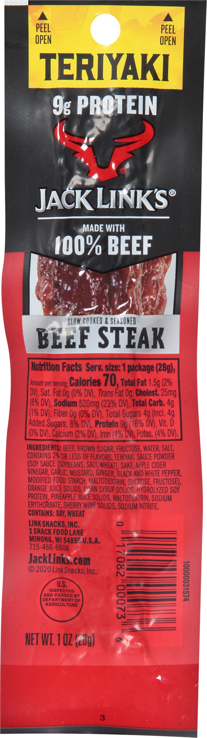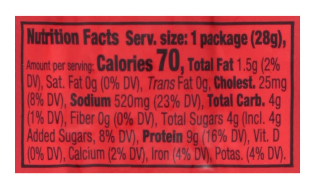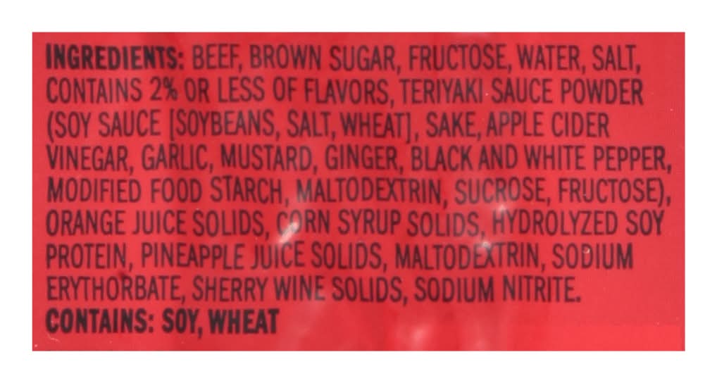 Ingredients: Beef, Brown Sugar, Fructose, Water, Salt, Contains 2% or Less of Flavors, Teriyaki Sauce Powder (Soy Sauce [Soybeans, Salt, Wheat], Sake, Apple Cider Vinegar, Garlic, Mustard, Ginger, Black and White Pepper, Modified Food Starch, Maltodextrin, Sucrose, Fructose), Orange Juice Solids, Corn Syrup Solids, Hydrolyzed Soy Protein, Pineapple Juice Solids, Maltodextrin, Sodium Erythorbate, Sherry Wine Solids, Sodium Nitrite Contains: Soybeans, Wheat, Mustard, Corn