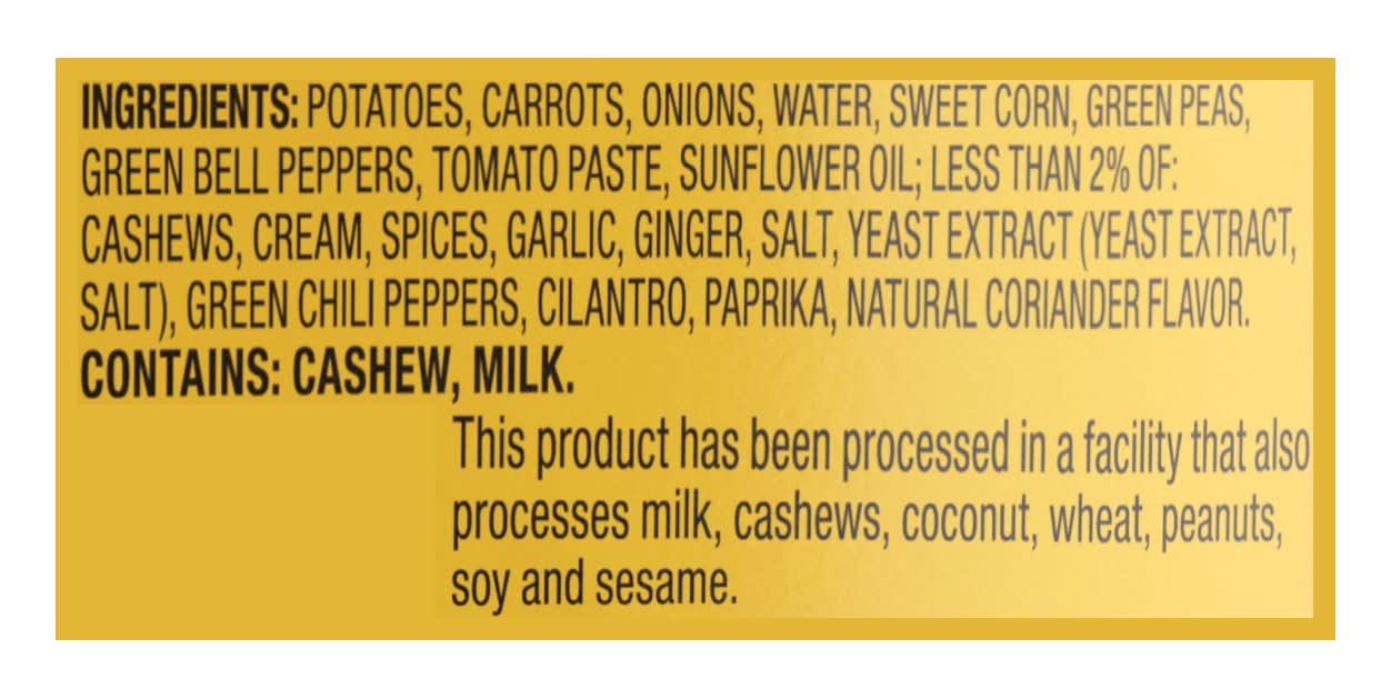 Ingredients: Potatoes, Carrots, Onions, Water, Sweet Corn, Green Peas, Green Bell Peppers, Tomato Paste, Sunflower Oil; Less than 2% of: Cashews, Cream, Spices, Garlic, Ginger, Salt, Yeast Extract (Yeast Extract, Salt), Green Chili Peppers, Cilantro, Paprika, Natural Coriander Flavor. Contains: Tree Nuts, Cashews, Milk, Milk, Tree Nuts, Cashews, Tree Nuts, Coconuts, Wheat, Peanuts, Soybeans, Sesame
