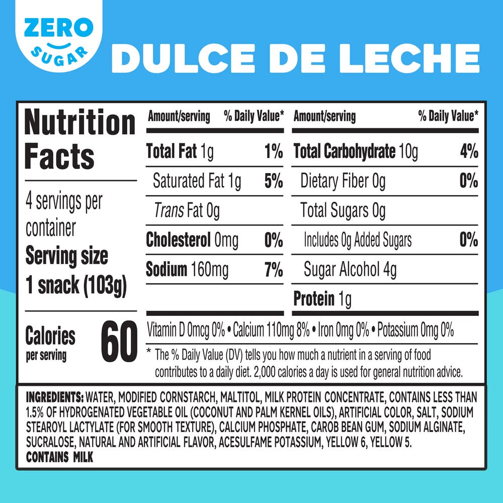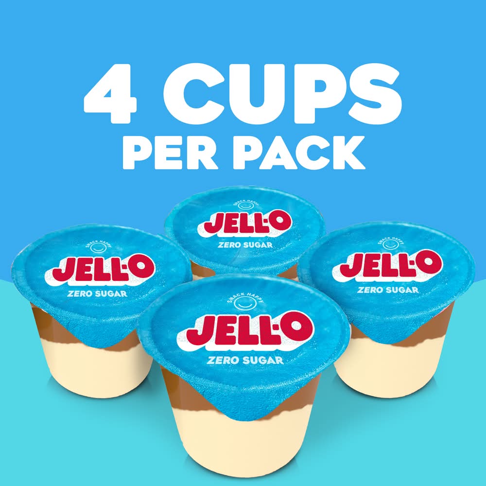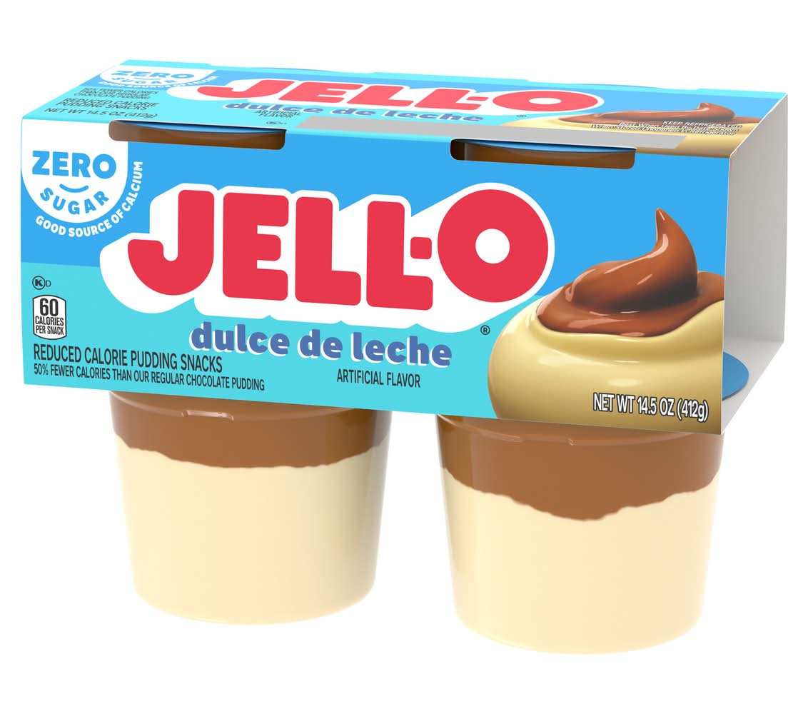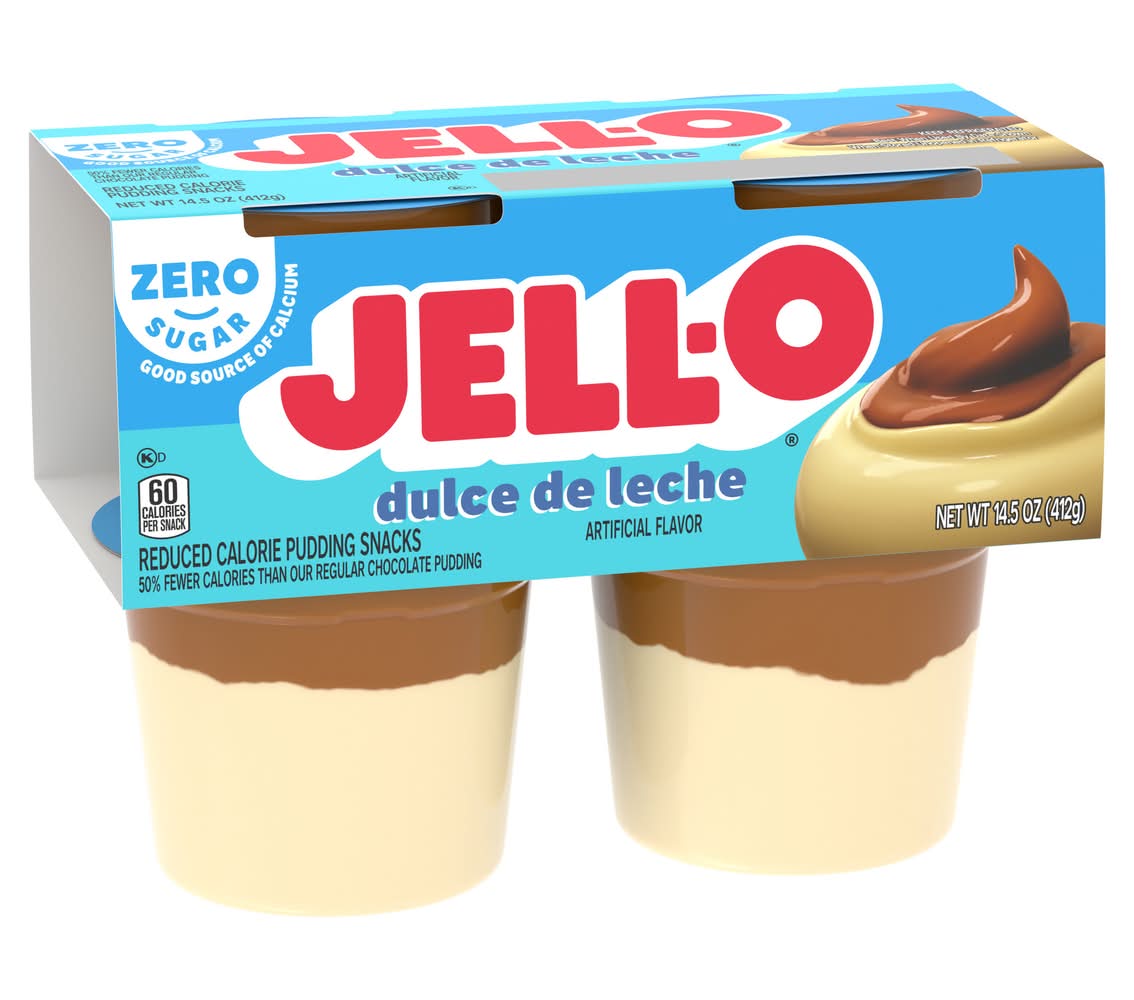 Snack happy. Jell-O Zero Sugar Dulce de Leche Artificially Flavored Pudding Cups deliver the great taste of Jell-O Pudding in a reduced-calorie choice. Our delicious on-the-go pudding comes in individual snack cups, perfect for putting into a lunchbox or snacking at home. Our creamy artificially flavored dulce de leche pudding contains 60 calories per serving, which is 50% fewer calories than regular Jell-O chocolate pudding. Each sleeve contains four Jell-O Zero Sugar Ready-to-Eat Dulce de Leche Artificially Flavored Pudding cups for quick and easy snacking. • Number of servings: 4 • Kraft Heinz Foods Company, Chicago, IL, 60601