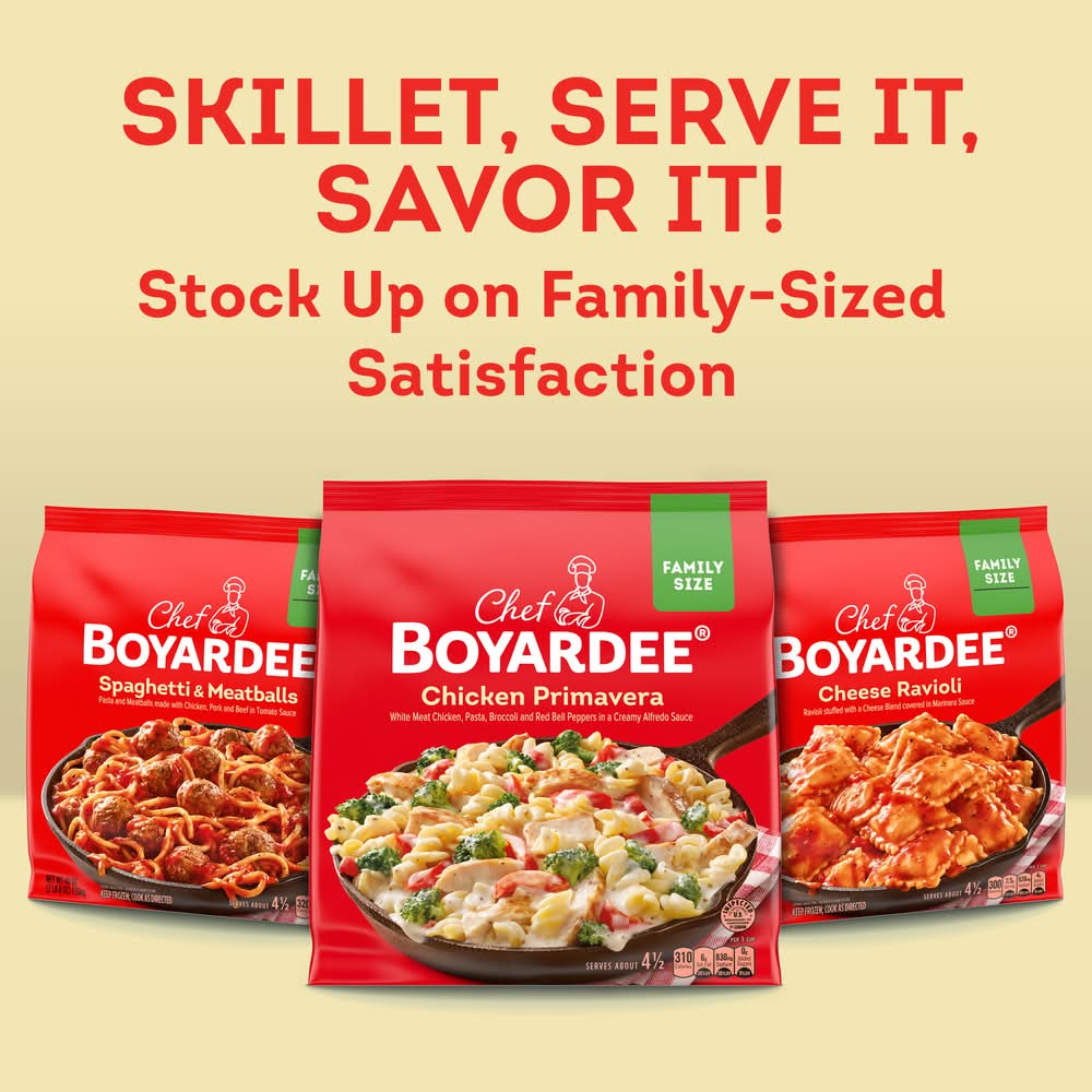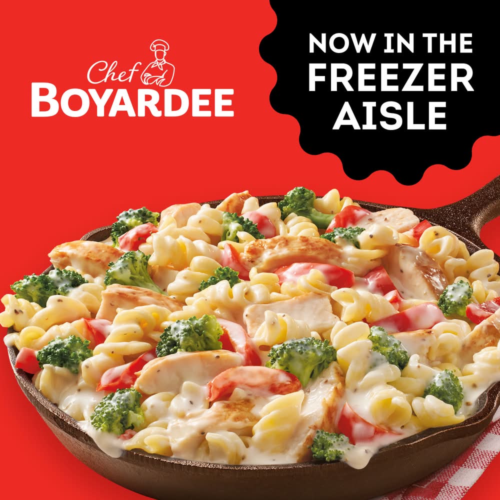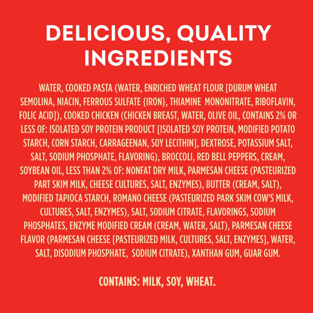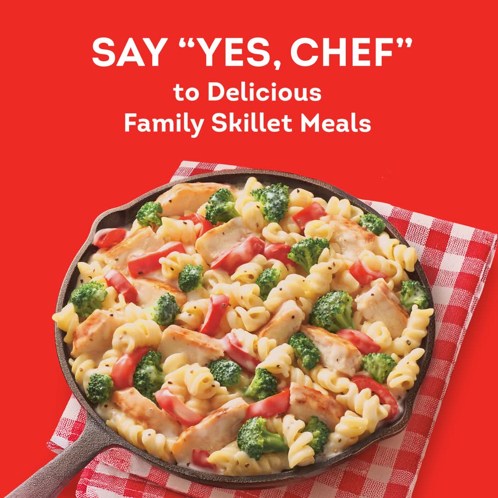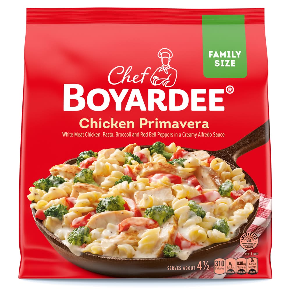Enjoy the perfect Italian-inspired family meal with a Chef Boyardee Chicken Primavera Family Size Skillet Meal. This frozen pasta skillet meal features delicious, hearty ingredients like white meat chicken, pasta, broccoli and red bell peppers in a creamy alfredo sauce. Chef Boyardee's frozen meals are the answer to busy weeks when you don't have time to make dinner from scratch. Instead, provide your family with an effortless frozen skillet meal bursting with home-cooked flavor that is both convenient and a real crowd-pleaser. Just add the chicken, vegetables, pasta and alfredo sauce to a large skillet, cover and stir occasionally for a ready-to-eat meal that takes less than 15 minutes to prepare. Mangia!