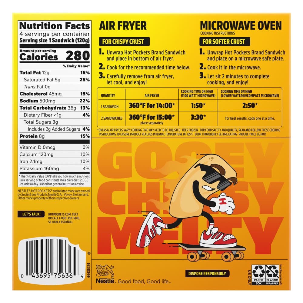 Dive into the cheesy, saucy and savory world of snacking with Hot Pockets Sausage, Egg and Cheese in a croissant crust 4 PK. This box comes with 4 frozen sandwiches, so you can share with friends and family or save some for later. These Hot Pockets sandwiches are loaded with seasoned breakfast sausage pieces, fluffy scrambled eggs, reduced-fat cheddar cheese, and sauce in a flaky croissant crust. These indulgent sausage egg and cheese aren’t your average frozen snack. Hot Pockets frozen sandwiches are hunger’s worst nightmare, delivering the bold flavors of a breakfast sandwich in a hearty microwaveable snack. Great for gaming all night or a quick snack before heading out the door – sausage Hot Pockets are perfect for any occasion. These frozen sandwiches are a good source of protein with 8 grams per serving. Cook this microwave food for 1 minute, 50 seconds on high for a quick snack, or air fry at 360 degrees Fahrenheit for 14 minutes if you want a crispier crust. Keep your Hot Pockets frozen until ready to cook and eat. Packaging: Reusable