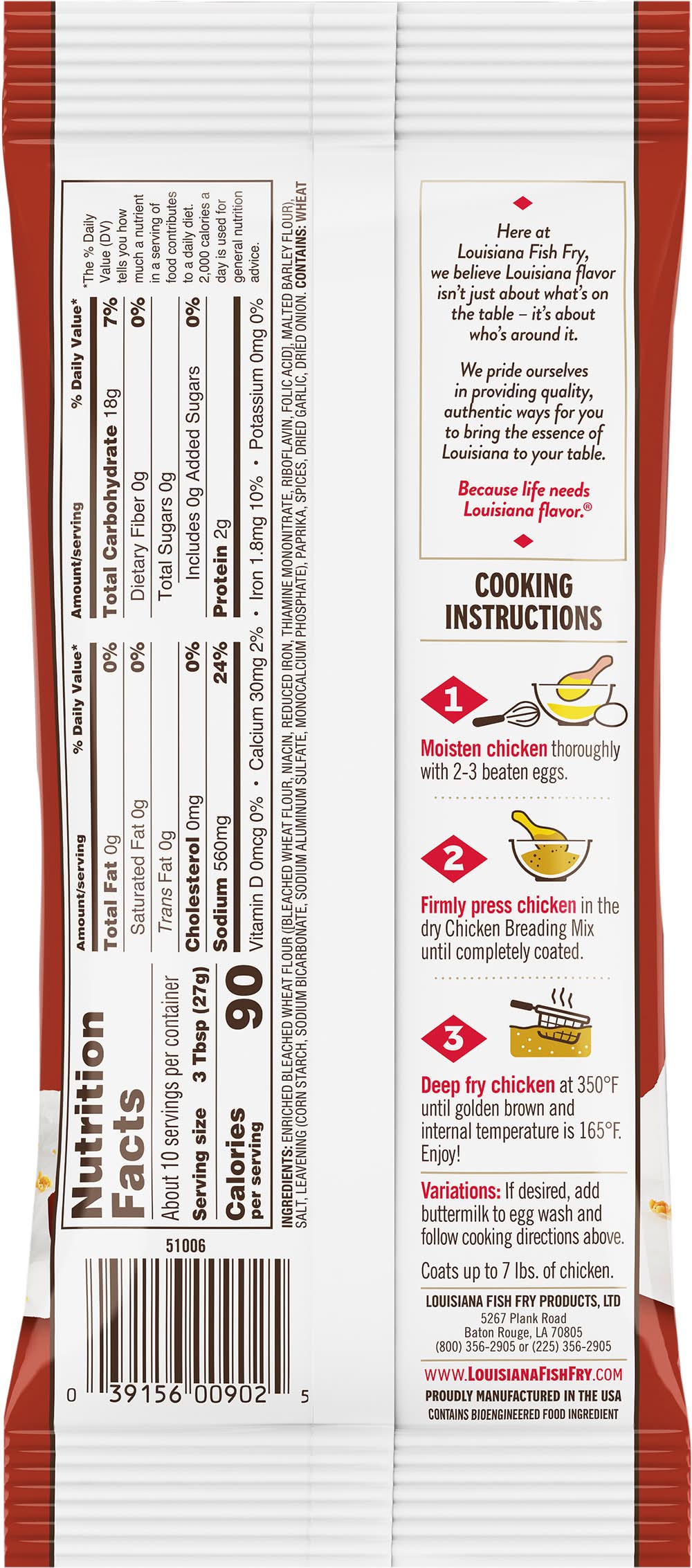 Cooking directions: 3 easy steps. 1. whip 2-3 eggs in medium bowl until smooth. coat chicken in egg mixture. 2. coat chicken in la homestyle chicken batter mix. 3. deep fry chicken at 350 degrees f until internal temperature is 165 degrees f and until golden brown. variations: if desired, add buttermilk to egg wash and follow cooking directions above. la homestyle chicken fry batter mix coats approximately 3 lbs. of chicken.