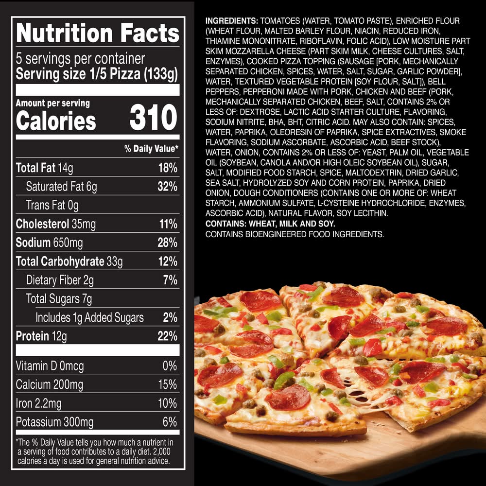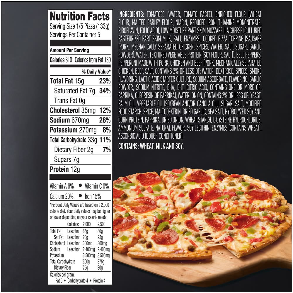 Ingredients: INGREDIENTS: TOMATOES (WATER, TOMATO PASTE), ENRICHED FLOUR (WHEAT FLOUR, MALTED BARLEY FLOUR, NIACIN, REDUCED IRON, THIAMINE MONONITRATE, RIBOFLAVIN, FOLIC ACID), LOW MOISTURE PART SKIM MOZZARELLA CHEESE (PART SKIM MILK, CHEESE CULTURES, SALT, ENZYMES), COOKED PIZZA TOPPING (SAUSAGE [PORK, MECHANICALLY SEPARATED CHICKEN, SPICES, WATER, SALT, SUGAR, GARLIC POWDER], WATER, TEXTURED VEGETABLE PROTEIN [SOY FLOUR, SALT]), BELL PEPPERS, PEPPERONI MADE WITH PORK, CHICKEN AND BEEF (PORK, MECHANICALLY SEPARATED CHICKEN, BEEF, SALT, CONTAINS 2% OR LESS OF: DEXTROSE, LACTIC ACID STARTER CULTURE, FLAVORING, SODIUM NITRITE, BHA, BHT, CITRIC ACID. MAY ALSO CONTAIN: SPICES, WATER, PAPRIKA, OLEORESIN OF PAPRIKA, SPICE EXTRACTIVES, SMOKE FLAVORING, SODIUM ASCORBATE, ASCORBIC ACID, BEEF STOCK), WATER, ONION, CONTAINS 2% OR LESS OF: YEAST, PALM OIL, VEGETABLE OIL (SOYBEAN, CANOLA AND/OR HIGH OLEIC SOYBEAN OIL), SUGAR, SALT, MODIFIED FOOD STARCH, SPICE, MALTODEXTRIN, DRIED GARLIC, SEA SALT, HYDROLYZED SOY AND CORN PROTEIN, PAPRIKA, DRIED ONION, DOUGH CONDITIONERS (CONTAINS ONE OR MORE OF: WHEAT STARCH, AMMONIUM SULFATE, L-CYSTEINE HYDROCHLORIDE, ENZYMES, ASCORBIC ACID), NATURAL FLAVOR, SOY LECITHIN. Contains: Milk, Wheat, Soy