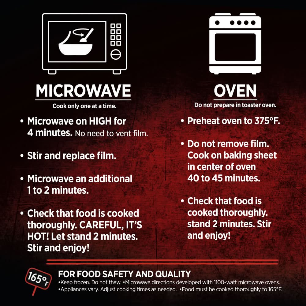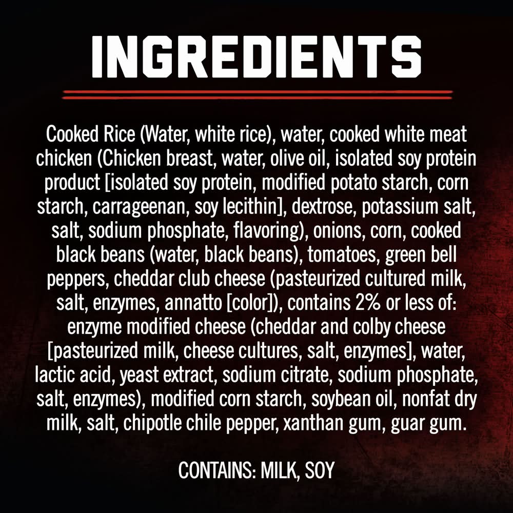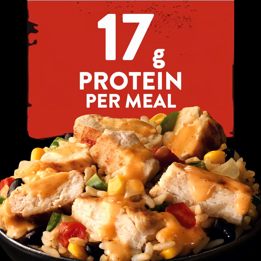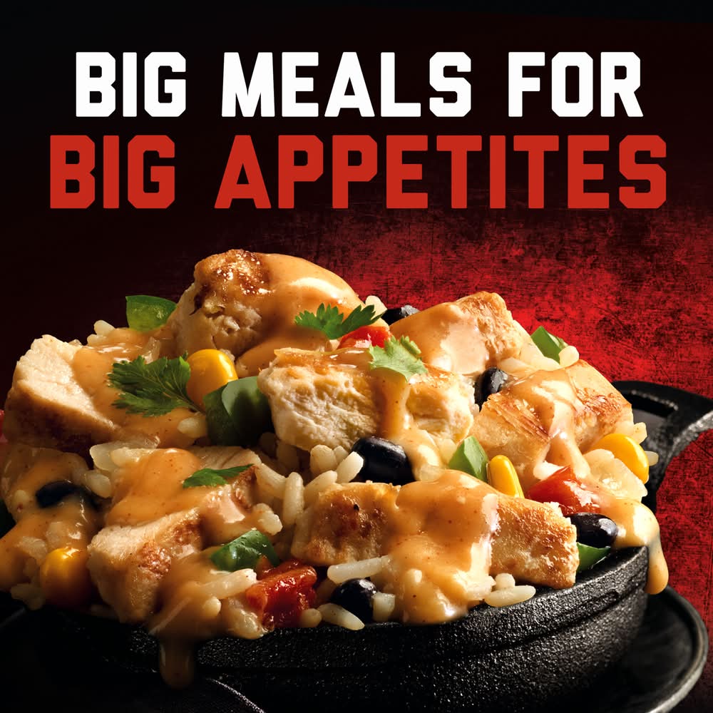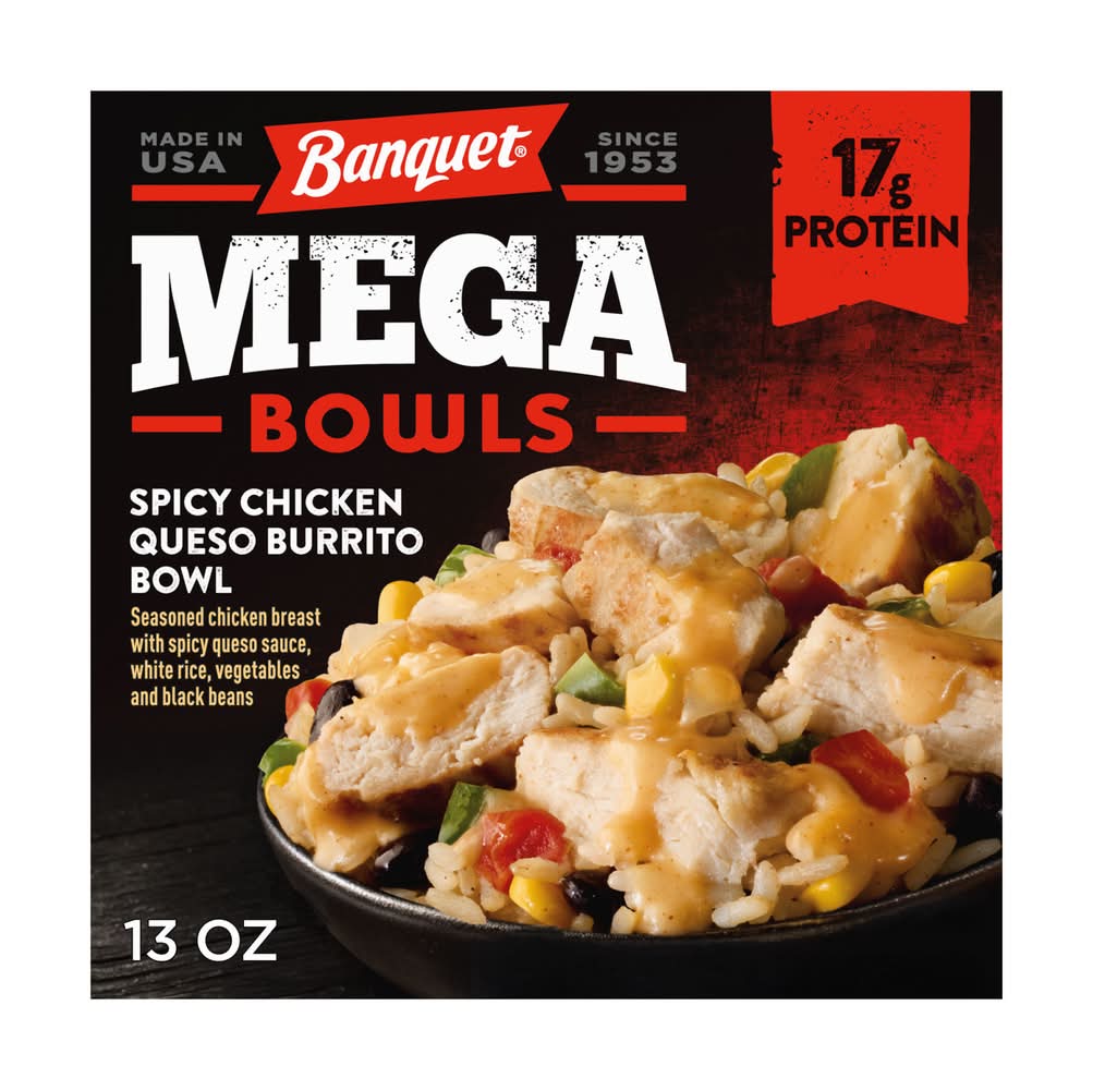 Satisfy your appetite with Banquet MEGA Bowls Spicy Chicken Queso Burrito Bowl. Seasoned chicken breast with spicy queso sauce, white rice, diced bell peppers, tomatoes, onions, corn and black beans make for a simply irresistible microwave meal. This tasty frozen burrito bowl has convenient oven or microwave prep so you can easily enjoy a comforting, spicy chicken burrito meal with 17 grams of protein per serving in a snap. From freezer to table in minutes, these delicious frozen meals are perfect for easy office lunches, quick frozen dinners and more. Banquet MEGA Meals and MEGA Bowls serve up bold flavors for bold appetites in hearty meals.
