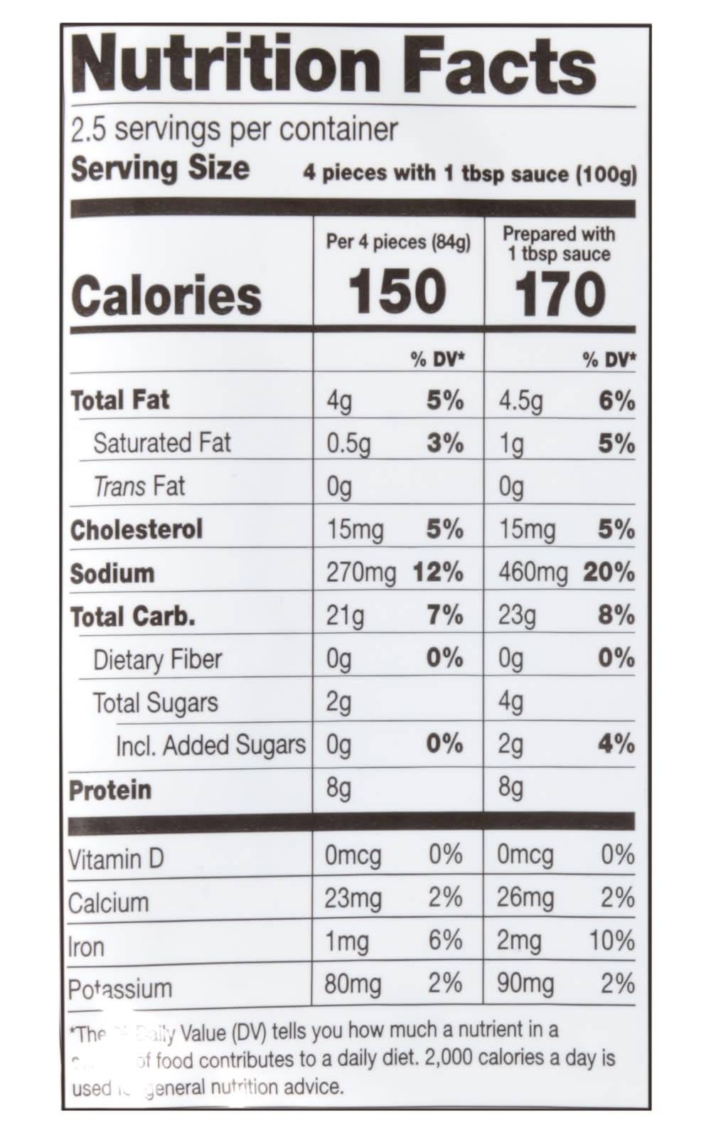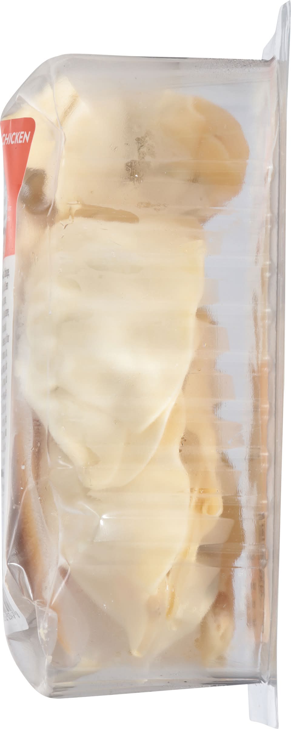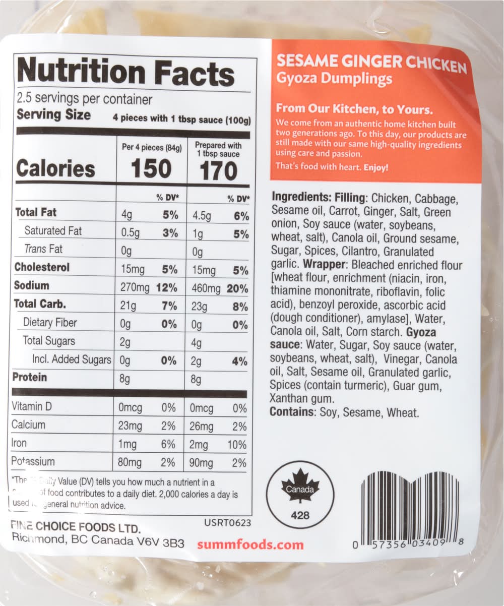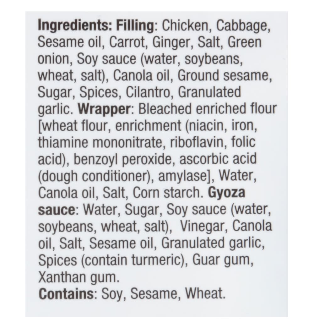 Ingredients: Filling: Chicken, Cabbage, Sesame Oil, Carrot, Ginger, Salt, Green Onion, Soy Sauce (Water, Soybeans, Wheat, Salt), Canola Oil, Ground Sesame, Sugar, Spices, Cilantro, Granulated Garlic. Wrapper: Bleached Enriched Flour [Wheat Flour, Enrichment (Niacin, Iron, Thiamine Mononitrate, Riboflavin, Folic Acid), Benzoyl Peroxide, Ascorbic Acid (Dough Conditioner), Amylase], Water, Canola Oil, Salt, Corn Starch. Gyoza Sauce: Water, Sugar, Soy Sauce (Water, Soybeans, Wheat, Salt), Vinegar, Canola Oil, Salt, Sesame Oil, Granulated Garlic, Spices (Contain Turmeric), Guar Gum, Xanthan Gum Contains: Soybeans, Sesame, Wheat, Corn