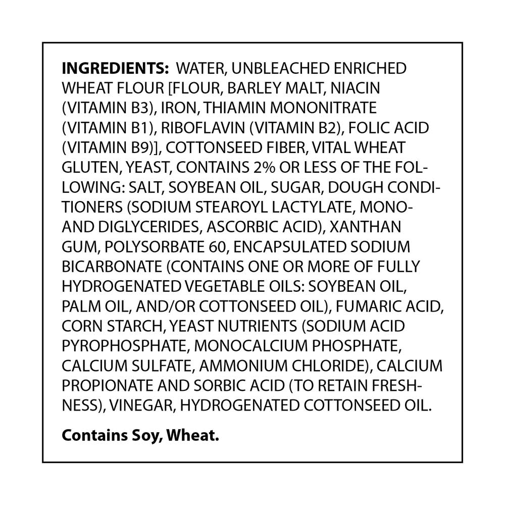 Ingredients: INGREDIENTS: WATER, UNBLEACHED ENRICHED WHEAT FLOUR [FLOUR, BARLEY MALT, NIACIN (VITAMIN B3), IRON, THIAMIN MONONITRATE (VITAMIN B1), RIBOFLAVIN (VITAMIN B2), FOLIC ACID (VITAMIN B9)], COTTONSEED FIBER YEAST, WHEAT GLUTEN, CONTAINS 2% OR LESS OF THE FOLLOWING: SUGAR, ENCAPSULATED SODIUM BICARBONATE (CONTAINS ONE OR MORE OF FULLY HYDROGENATED VEGETABLE OILS: SOYBEAN OIL, PALM OIL, AND/OR COTTONSEED OIL, FUMARIC ACID, CORN STARCH, SODIUM ACID PYROPHOSPHATE, SALT, CALCIUM PROPIONATE AND SORBIC ACID (TO RETAIN FRESHNESS), SOYBEAN OIL, DOUGH CONDITIONER (SODIUM STEAROYL LACTYLATE, MONOCALCIUM PHOSPHATE, ASCORBIC ACID), YEAST NUTRIENTS (CALCIUM SULFATE), VINEGAR, XANTHAN GUM, POLYSORBATE 60, CONTAINS: SOY, WHEAT Contains: Contains soy and wheat.<br />Allergy Advisory: Produced on the same bakery equipment as baked goods containing milk, eggs, nuts or seeds. Therefore, this product may inadvertently contain milk, eggs, nuts or seeds to which some people may be allergic.