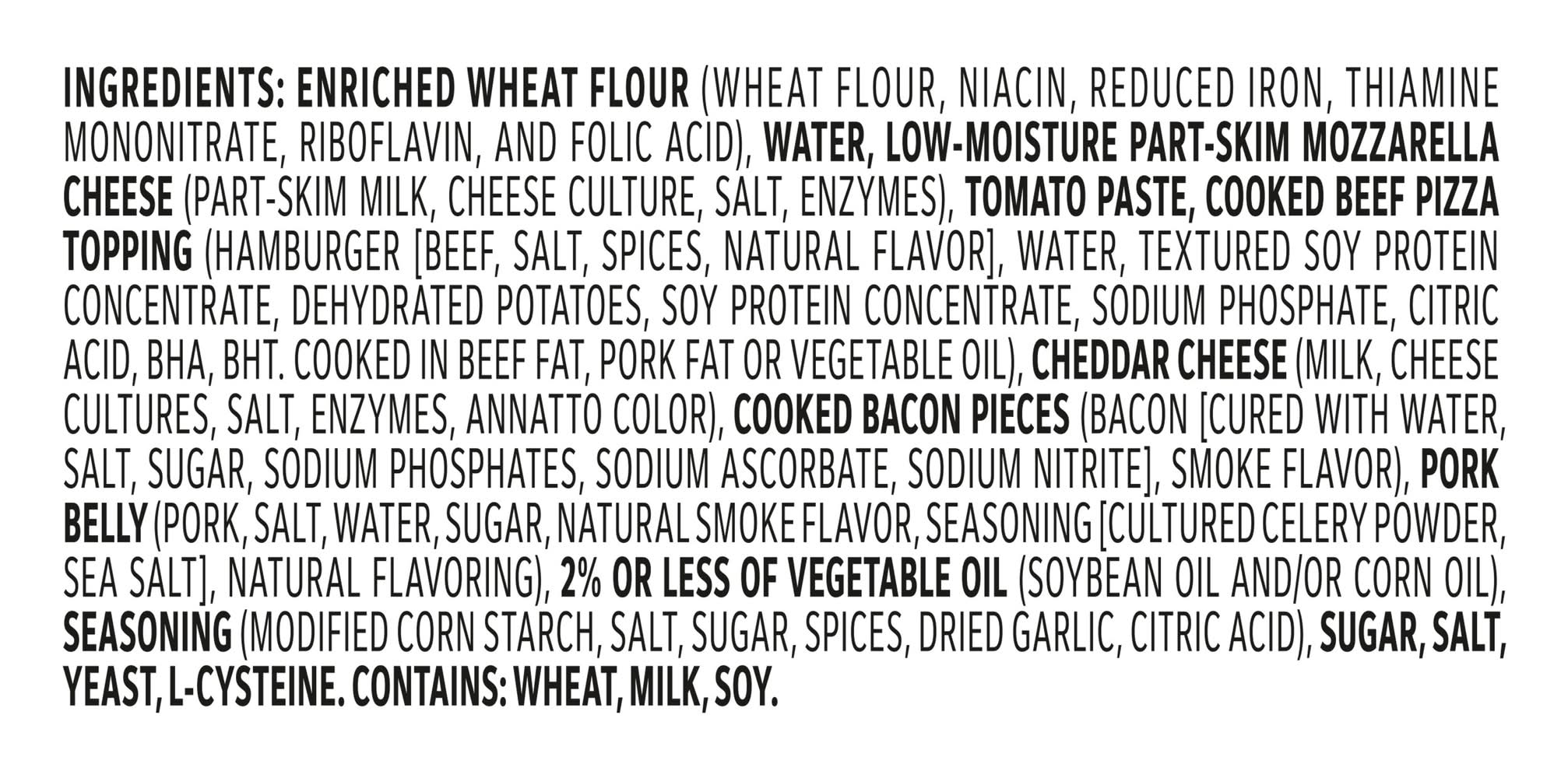Ingredients: ENRICHED WHEAT FLOUR (WHEAT FLOUR, NIACIN, REDUCED IRON, THIAMINE MONONITRATE, RIBOFLAVIN, AND FOLIC ACID), WATER, LOW-MOISTURE PART-SKIM MOZZARELLA CHEESE (PART-SKIM MILK, CHEESE CULTURE, SALT, ENZYMES), TOMATO PASTE, COOKED BEEF PIZZA TOPPING (HAMBURGER [BEEF, SALT, SPICES, NATURAL FLAVOR], WATER, TEXTURED SOY PROTEIN CONCENTRATE, DEHYDRATED POTATOES, SOY PROTEIN CONCENTRATE, SODIUM PHOSPHATE, CITRIC ACID, BHA, BHT. COOKED IN BEEF FAT, PORK FAT OR VEGETABLE OIL), CHEDDAR CHEESE (MILK, CHEESE CULTURES, SALT, ENZYMES, ANNATTO COLOR), COOKED BACON PIECES (BACON [CURED WITH WATER, SALT, SUGAR, SODIUM PHOSPHATES, SODIUM ASCORBATE, SODIUM NITRITE], SMOKE FLAVOR), PORK BELLY (PORK, SALT, WATER, SUGAR, NATURAL SMOKE FLAVOR, SEASONING [CULTURED CELERY POWDER, SEA SALT], NATURAL FLAVORING), 2% OR LESS OF VEGETABLE OIL (SOYBEAN OIL AND/OR CORN OIL), SEASONING (MODIFIED CORN STARCH, SALT, SUGAR, SPICES, DRIED GARLIC, CITRIC ACID), SUGAR, SALT, YEAST, L-CYSTEINE. Contains: CONTAINS: WHEAT, MILK, SOY.