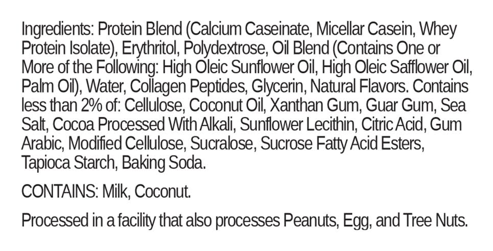 Ingredients: Protein Blend (Calcium Caseinate, Micellar Casein, Whey Protein Isolate), Erythritol, Polydextrose, Oil Blend (Contains One or More of the Following: High Oleic Sunflower Oil, High Oleic Safflower Oil, Palm Oil), Water, Collagen Peptides, Glycerin, Natural Flavors, Contains Less than 2% of: Cellulose, Coconut Oil, Xanthan Gum, Guar Gum, Sea Salt, Cocoa Processed with Alkali, Sunflower Lecithin, Citric Acid, Gum Arabic, Modified Cellulose, Sucralose, Sucrose Fatty Acid Esters, Tapioca Starch, Baking Soda Contains: Milk, Tree Nuts, Coconuts, Peanuts, Eggs, Tree Nuts