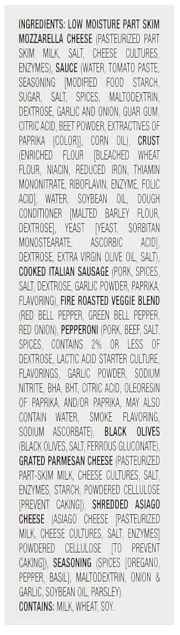 Ingredients: Low Moisture Part Skim Mozzarella Cheese (Pasteurized Part Skim Milk, Salt, Cheese Cultures, Enzymes), Sauce (Water, Tomato Paste, Seasoning [Modified Food Starch, Sugar, Salt, Spices, Maltodextrin, Dextrose, Garlic and Onion, Guar Gum, Citric Acid, Beet Powder, Extractives of Paprika (Color)], Corn Oil), Crust (Enriched Flour [Bleached Wheat Flour, Niacin, Reduced Iron, Thiamin Mononitrate, Riboflavin, Enzyme, Folic Acid], Water, Soybean Oil, Dough Conditioner [Malted Barley Flour, Dextrose], Yeast [Yeast, Sorbitan Monostearate, Ascorbic Acid], Dextrose, Extra Virgin Olive Oil, Salt), Cooked Italian Sausage (Pork, Spices, Salt, Dextrose, Garlic Powder, Paprika, Flavoring), Fire Roasted Veggie Blend (Red Bell Pepper, Green Bell Pepper, Red Onion), Pepperoni (Pork, Beef, Salt, Spices, Contains 2% or Less of Dextrose, Lactic Acid Starter Culture, Flavorings, Garlic Powder, Sodium Nitrite, BHA, BHT, Citric Acid, Oleoresin of Paprika and/or Paprika May Also Contain Water, Smoke Flavoring, Sodium Ascorbate), Black Olives (Black Olives, Salt, Ferrous Gluconate), Grated Parmesan Cheese (Pasteurized Part-Skim Milk, Cheese Cultures, Salt, Enzymes, Starch, Powdered Cellulose [Prevent Caking]), Shredded Asiago Cheese (Asiago Cheese [Pasteurized Milk, Cheese Cultures, Salt, Enzymes], Powdered Cellulose [to Prevent Caking]), Seasoning (Spices (Oregano, Pepper, Basil], Maltodextrin, Onion & Garlic, Soybean Oil, Parsley) Contains: Milk, Wheat, Soybeans, Barley
