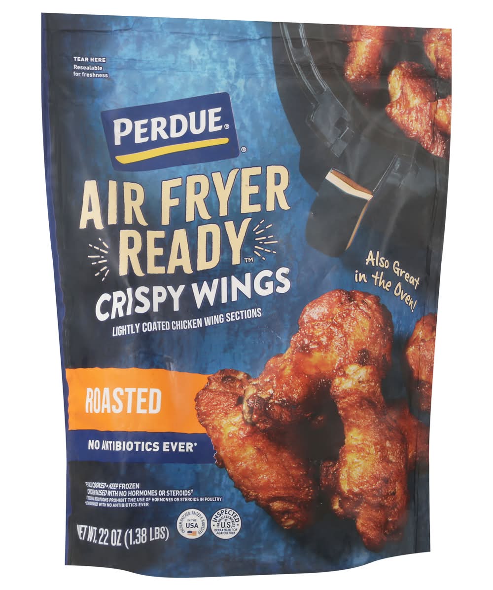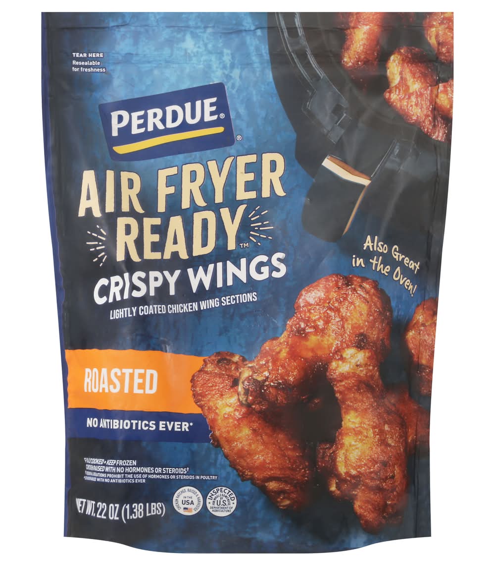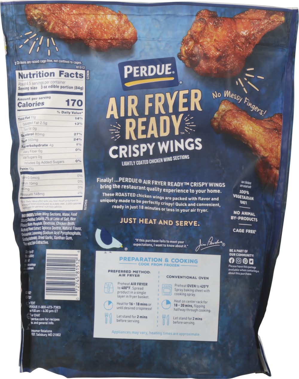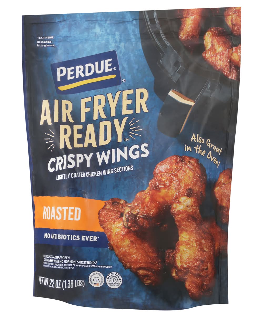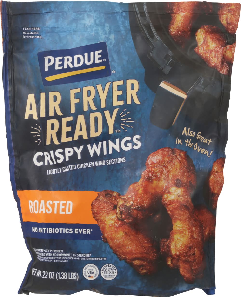 Lightly coated chicken wing sections. Air fryer ready. Also great in the oven! No antibiotics ever (Chicken raised with no antibiotics ever). Fully cooked. Chicken raised with no hormones or steroids added (Federal regulations prohibit the use of hormones or steroids in poultry). Finally! Perdue Air Fryer Read Crispy Wings bring the restaurant quality experience to your home. These roasted chicken wings are packed with flavor and uniquely made to be perfectly crispy! Quick and convenient, ready in just 18 minutes or less in your air fryer. Just heat and serve. Our chickens are raised with 100% vegetarian diet. No animal by-products. Cage free (Chicken are raised cage-free, not confined to cages).