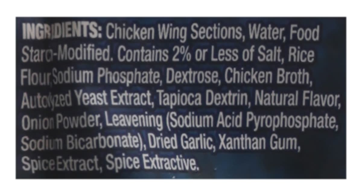 Ingredients: Chicken Wing Sections, Water, Food Starch-Modified, Contains 2% or Less of Salt, Rice Flour, Sodium Phosphate, Dextrose, Chicken Broth, Autolyzed Yeast Extract, Tapioca Dextrin, Natural Flavor, Onion Powder, Leavening (Sodium Acid Pyrophosphate, Sodium Bicarbonate), Dried Garlic, Xanthan Gum, Spice Extract, Spice Extractive