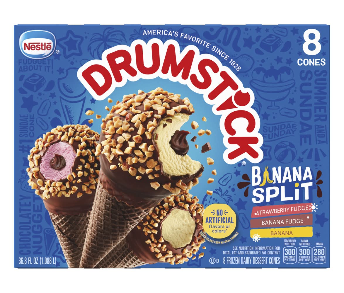 Drumstick Banana Split Sundae Cones feature deliciously creamy banana and strawberry centers for a frozen treat with plenty of creaminess, chocolatey flavor and crunchability. Starting with a crispy chocolatey cone with banana or strawberry centers, dipped in a chocolatey coating, and savory roasted peanuts, the Nestle Drumstick cone creates a snacking experience unlike any other dessert - and that's before you get to the unforgettable chocolatey nugget! No two bites are the same with The Original Sundae Cone. Plus, this tasty frozen dessert is made with no artificial flavors or colors* for a frozen treat for the entire family. Each Drumstick Banana Split Sundae cone comes individually wrapped for quick, convenient snacking. Celebrate with The Original Sundae Cone and get the classic ice cream cone flavor you love all in one unique eating experience with Nestle Drumstick! (*Added colors from natural sources) • Flavor: Strawberry fudge-banana fudge-banana • Packaging: Reusable