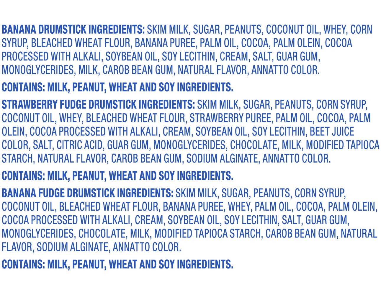 Ingredients: INGREDIENTS: BANANA DRUMSTICK: SKIM MILK SUGAR PEANUTS COCONUT OIL WHEY CORN SYRUP BLEACHED WHEAT FLOUR BANANA PUREE PALM OIL COCOA PALM OLEIN COCA PROCESSED WITH ALKALI SOYBEAN OIL, SOY LECITHIN CREAM SALT GUAR GUM MONOGLYCERIDES MILK CAROB BEAN GUM NATURAL FLAVOR ANNATTO COLOR. STRAWBERRY FUDGE DRUMSTICK: SKIM MILK SUGAR PEANUTS CORN SYRUP COCONUT OIL WHEY BLEACHED WHEAT FLOUR, STRAWBERRY PUREE PALM OIL COCOA PALM OLEIN COCOA PROCESSED WITH ALKALI CREAM SOYBEAN OIL SOY LECITHIN BEET JUICE COLOR SALT CITRIC ACID GUAR GUM MONOGLYCERIDES CHOCOLATE MILK MODIFIED TAPIOCA STARCH NATURAL FLAVOR, CAROB BEAN GUM SODIUM ALGINATE ANNATTO COLOR. BANANA FUDGE DRUMSTICK: SKIM MILK SUGAR PEANUTS CORN SYRUP COCONUT OIL BLEACHED WHEAT FLOUR BANANA PUREE WHEY PALM OIL COCOA PALM OLEIN COCOA PROCESSED WITH ALKALI CREAM, PALM OIL COCOA PALM OLEIN COCOA PROCESSED WITH ALKALI CREAM SOYBEAN OIL SOY LECITHIN SALT GUAR GUM MONOGLYCERIDES CHOCOLATE MILK MODIFIED TAPIOCA STARCH CAROB BEAN GUM NATURAL FLAVOR SODIUM ALGINATE ANNATTO COLOR. Contains: CONTAINS: MILK; PEANUT; WHEAT AND SOY INGREDIENTS.