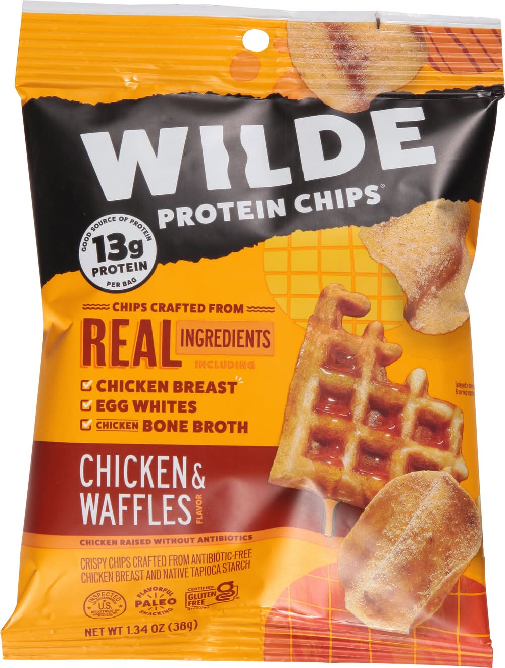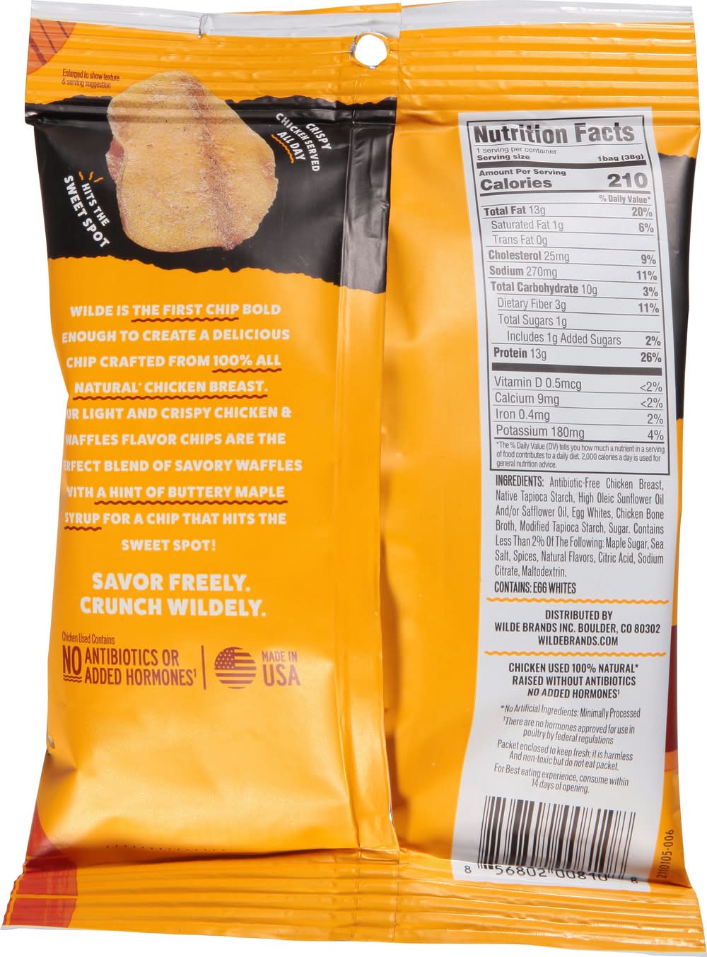 Chips crafted from antibiotic-free chicken breast and native tapioca starch. 13 g protein per bag. Certified Gluten free. gfco.org. Paleo flavorful snacking. Good source of protein. Chips crafted from real ingredients including: Chicken breast; egg whites; chicken bone broth. Chicken raised without antibiotics. Crispy chicken served all day. Hits the sweet spot. Wilde is the first chip bold enough to create a delicious chip crafted from 100% all natural (No artificial ingredients; Minimally processed) chicken breast. Our light and crispy chicken & waffles flavor chips are the perfect blend of savory waffles with a hint of buttery maple syrup for a chip that hits the sweet spot! Savor freely. Crunch wildely. Chicken used contains no antibiotics or hormones (There are no hormones approved for use in the production of poultry by federal regulations). Chicken used 100% natural Flavor: Chicken & waffles