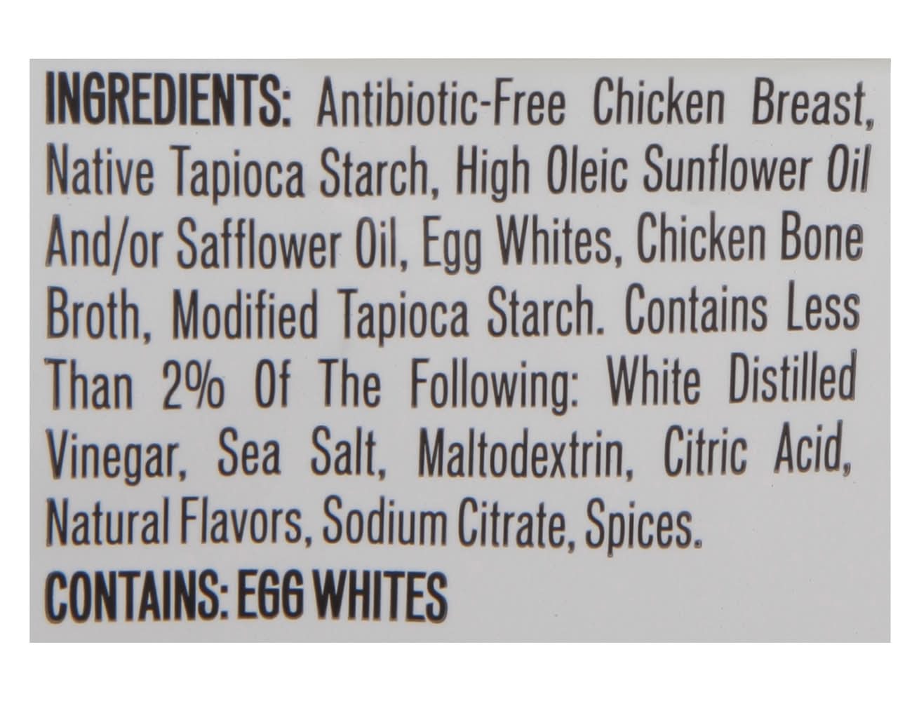 Ingredients: Antibiotic-Free Chicken Breast, Native Tapioca Starch, High Oleic Sunflower Oil and/or Safflower Oil, Egg Whites, Chicken Bone Broth, Modified Tapioca Starch, Sugar, Contains Less than 2% of the Following: Maple Sugar, Sea Salt, Spices, Natural Flavors, Citric Acid, Sodium Citrate, Maltodextrin Contains: Eggs