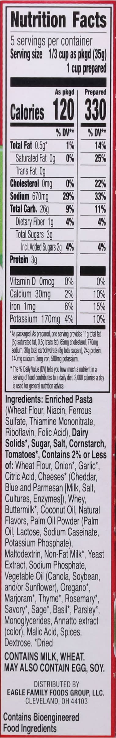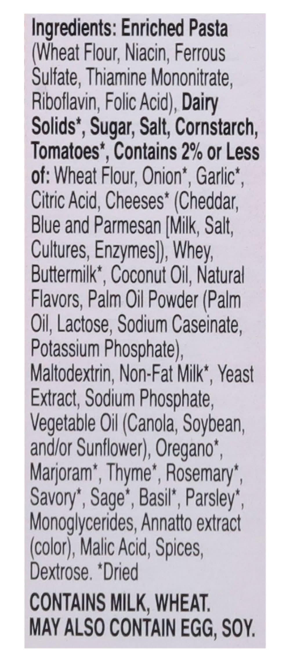 Ingredients: Enriched Pasta (Wheat Flour, Niacin, Ferrous Sulfate, Thiamine Mononitrate, Riboflavin, Folic Acid), Dairy Solids (Dried), Sugar, Salt, Cornstarch, Tomatoes (Dried), Contains 2% or Less of: Wheat Flour, Onion (Dried), Garlic (Dried), Citric Acid, Cheeses (Dried) (Cheddar, Blue and Parmesan [Milk, Salt, Cultures, Enzymes]), Whey, Buttermilk (Dried), Coconut Oil, Natural Flavors, Palm Oil Powder (Palm Oil, Lactose, Sodium Caseinate, Potassium Phosphate), Maltodextrin, Non-Fat Milk (Dried), Yeast Extract, Sodium Phosphate, Vegetable Oil (Canola, Soybean, and/or Sunflower), Oregano (Dried), Marjoram (Dried), Thyme (Dried), Rosemary (Dried), Savory (Dried), Sage (Dried), Basil (Dried), Parsley (Dried), Monoglycerides, Annatto Extract (Color), Malic Acid, Spices, Dextrose Contains: Wheat, Corn, Milk, Lactose, Tree Nuts, Coconuts, Eggs, Soybeans Additives: Genetically Modified Ingredients