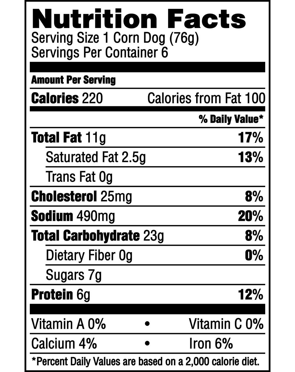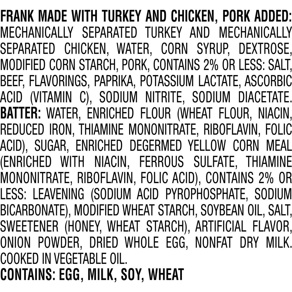 Ingredients: Frank Made with Turkey and Chicken, Pork Added: Mechanically Separated Turkey and Mechanically Separated Chicken, Water, Corn Syrup, Dextrose, Modified Corn Starch, Pork, Contains 2% or Less: Salt, Beef, Flavorings, Paprika, Potassium Lactate, Ascorbic Acid (Vitamin C), Sodium Nitrite, Sodium Diacetate. Batter: Water, Enriched Flour (Wheat Flour Niacin Reduced Iron Thiamine Mononitrate Riboflavin Folic Acid), Sugar, Enriched Degermed Yellow Corn Meal (Enriched with Niacin Ferrous Sulfate Thiamine Mononitrate Riboflavin Folic Acid), Contains 2% or Less: Leavening (Sodium Acid Pyrophosphate Sodium Bicarbonate), Modified Wheat Starch, Soybean Oil, Salt, Sweetener (Honey Wheat Starch), Artificial Flavor, Onion Powder, Dried Whole Egg, Nonfat Dry Milk, Cooked in Vegetable Oil Contains: Eggs, Milk, Soybeans, Wheat