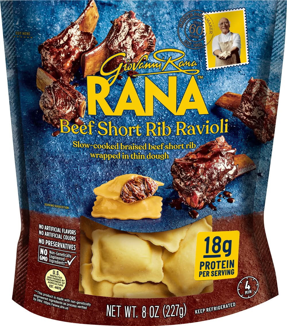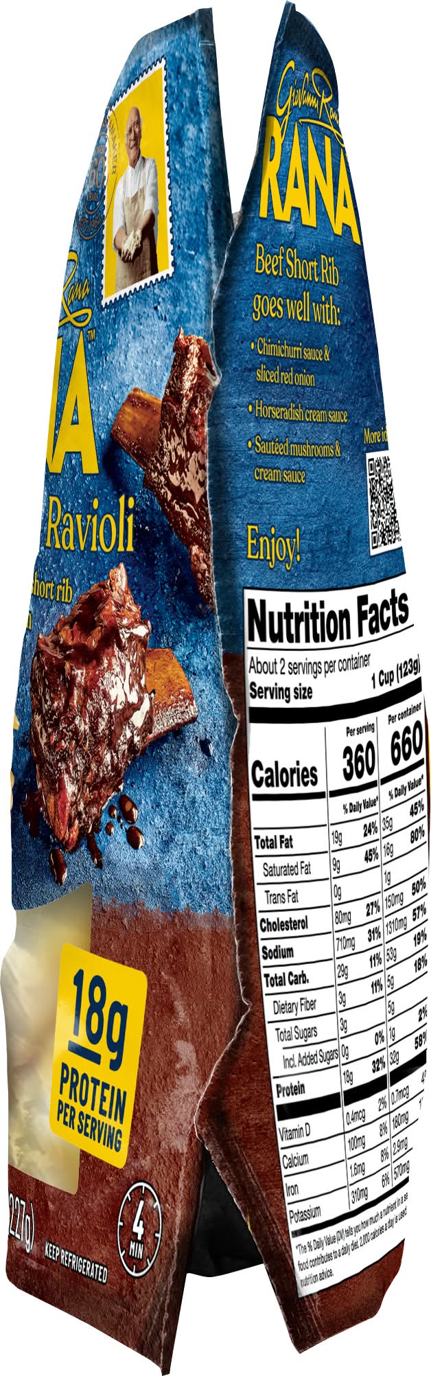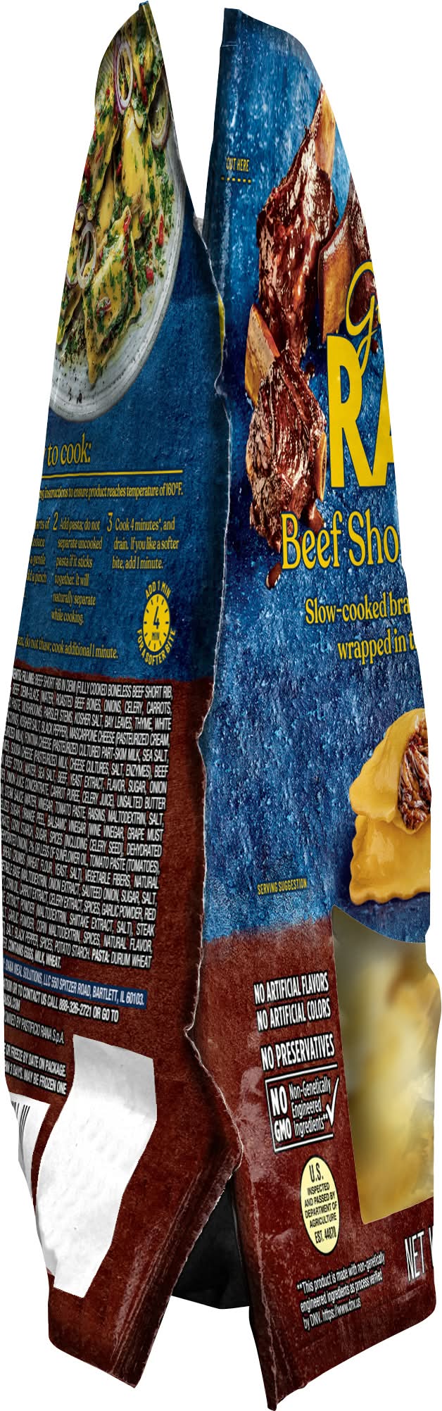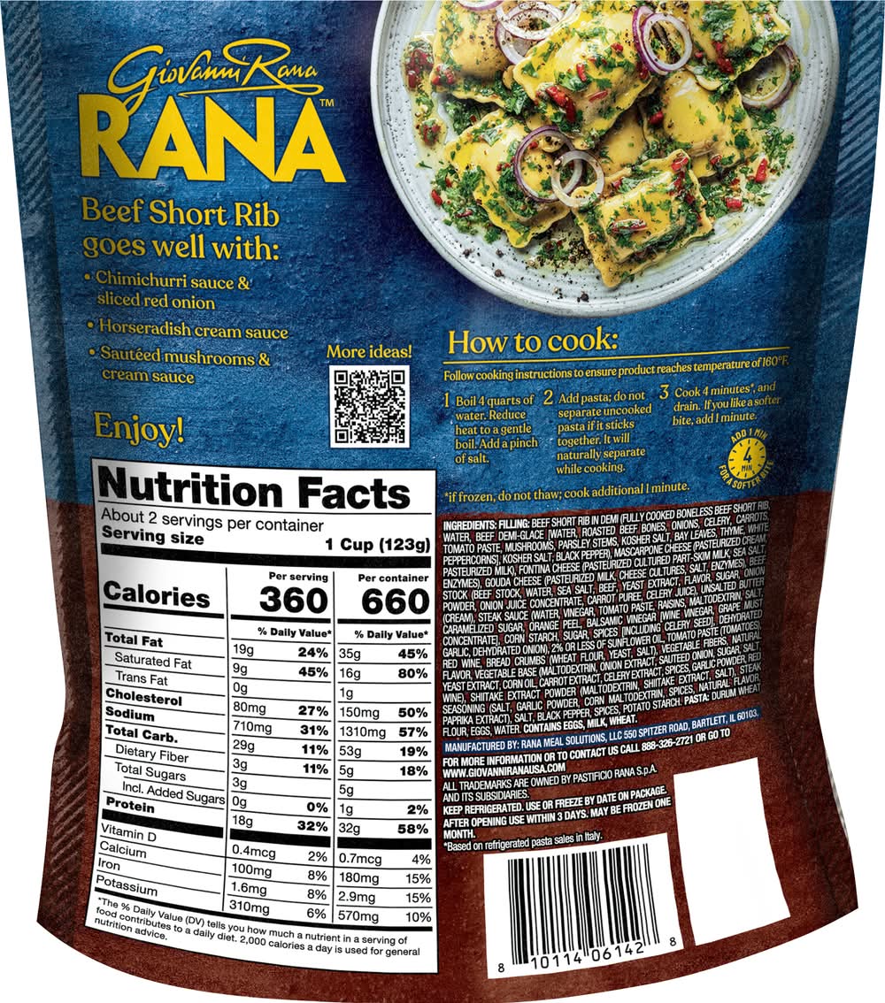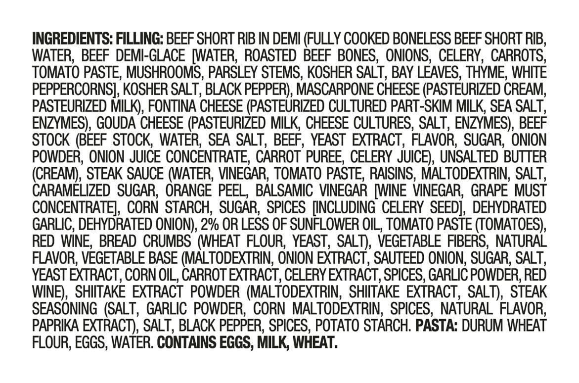Ingredients: Filling: Beef Short Rib in Demi (Fully Cooked Boneless Beef Short Rib, Water, Beef Demi-Glace [Water, Roasted Beef Bones, Onions, Celery, Carrots, Tomato Paste, Mushrooms, Parsley Stems, Kosher Salt, Bay Leaves, Thyme, White Peppercorns], Kosher Salt, Black Pepper), Mascarpone Cheese (Pasteurized Cream, Pasteurized Milk), Fontina Cheese (Pasteurized Cultured Part-Skim Milk, Sea Salt, Enzymes), Gouda Cheese (Pasteurized Milk, Cheese Cultures, Salt, Enzymes), Beef Stock (Beef Stock, Water, Sea Salt, Beef, Yeast Extract, Flavor, Sugar, Onion Powder, Onion Juice Concentrate, Carrot Puree, Celery Juice), Unsalted Butter (Cream), Steak Sauce (Water, Vinegar, Tomato Paste, Raisins, Maltodextrin, Salt, Caramelized Sugar, Orange Peel, Balsamic Vinegar [Wine Vinegar, Grape Must Concentrate], Corn Starch, Sugar, Spices [Including Celery Seed], Dehydrated Garlic, Dehydrated Onion), 2% or Less of Sunflower Oil, Tomato Paste (Tomatoes), Red Wine, Bread Crumbs (Wheat Flour, Yeast, Salt), Vegetable Fibers, Natural Flavor, Vegetable Base (Maltodextrin, Onion Extract, Sauteed Onion, Sugar, Salt, Yeast Extract, Corn Oil, Carrot Extract, Celery Extract, Spices, Garlic Powder, Red Wine), Shiitake Extract Powder (Maltodextrin, Shiitake Extract, Salt), Steak Seasoning (Salt, Garlic Powder, Corn Maltodextrin, Spices, Natural Flavor, Paprika Extract), Salt, Black Pepper, Spices, Potato Starch. Pasta: Durum Wheat Flour, Eggs, Water Contains: Celery, Milk, Wheat, Eggs