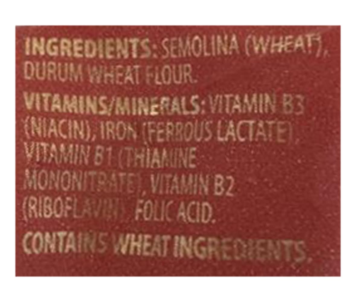 Ingredients: Semolina (Wheat), Durum Wheat Flour. Vitamins/Minerals: Vitamin B3 (Niacin), Iron (Ferrous Lactate), Vitamin B1 (Thiamine Mononitrate), Vitamin B2 (Riboflavin), Folic Acid Contains: Wheat