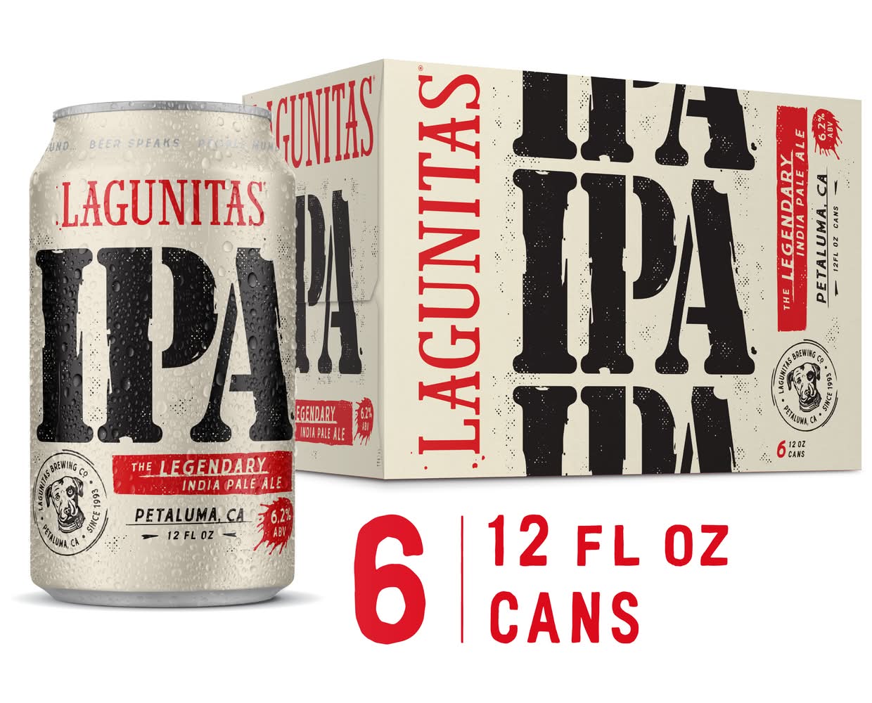 A DOGGONE GOOD IPA: Bring balance to your taste buds and your taste best friends with this doggone good IPA beer that's super drinkable and conveniently packaged in these six, 12-fluid-ounce cans,COAST TO COAST: This West Coast IPA was dreamed up in California 30-odd years ago amongst the redwoods, rugged coastlines and rolling hills of Sonoma County, and is now brewed from Petaluma to Chicago and beyond,LIFE IS UNCERTAIN, DON'T SIP: The Lagunitas Brewing Company began on a kitchen stove in Northern California in 1993 and now finds itself innovating the next evolution of beers, spiked teas and non-alcoholic beverages,ONE BALANCED IPA: More balanced than an 8 legged chair—in fact, it's so balanced that it pairs well with pretty much any food and darn near anything else, making it the perfect beer to finish a day or start an evening,THE GOLD STANDARD: Our hop-forward approach to brewing has become a reality with our original flagship IPA—highly balanced and super drinkable, it's the gold standard of IPAs • Pack size: 6 • Alcohol by volume: 6.2%