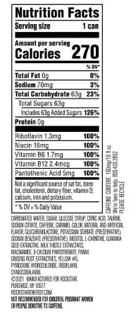 Rockstar Original Guarana Energy Drink is formulated with B-vitamins, guarana, taurine, and caffeine. It contains 75mg of caffeine, which has been shown to help improve attention. The drink is designed to provide an invigorating taste. • Rockstar, Las Vegas, NV 89109, • Packaging: Reusable