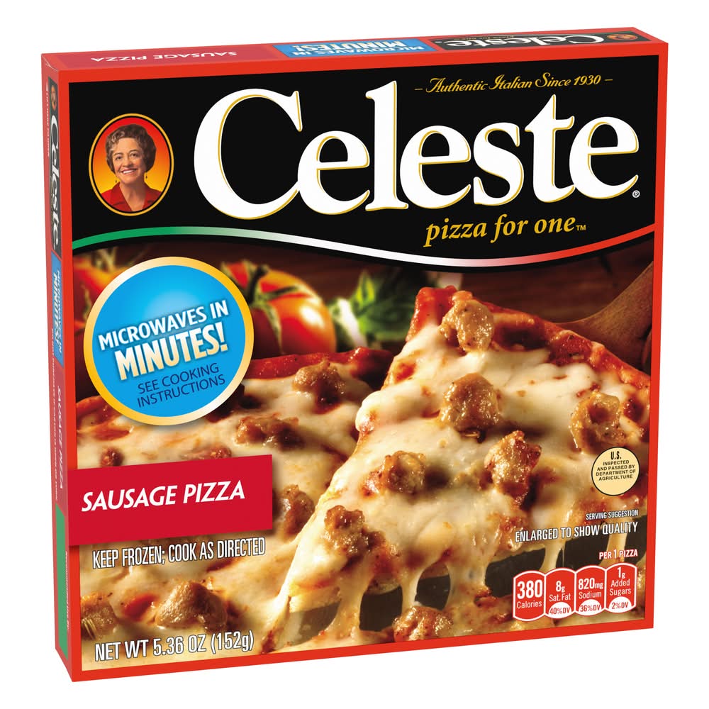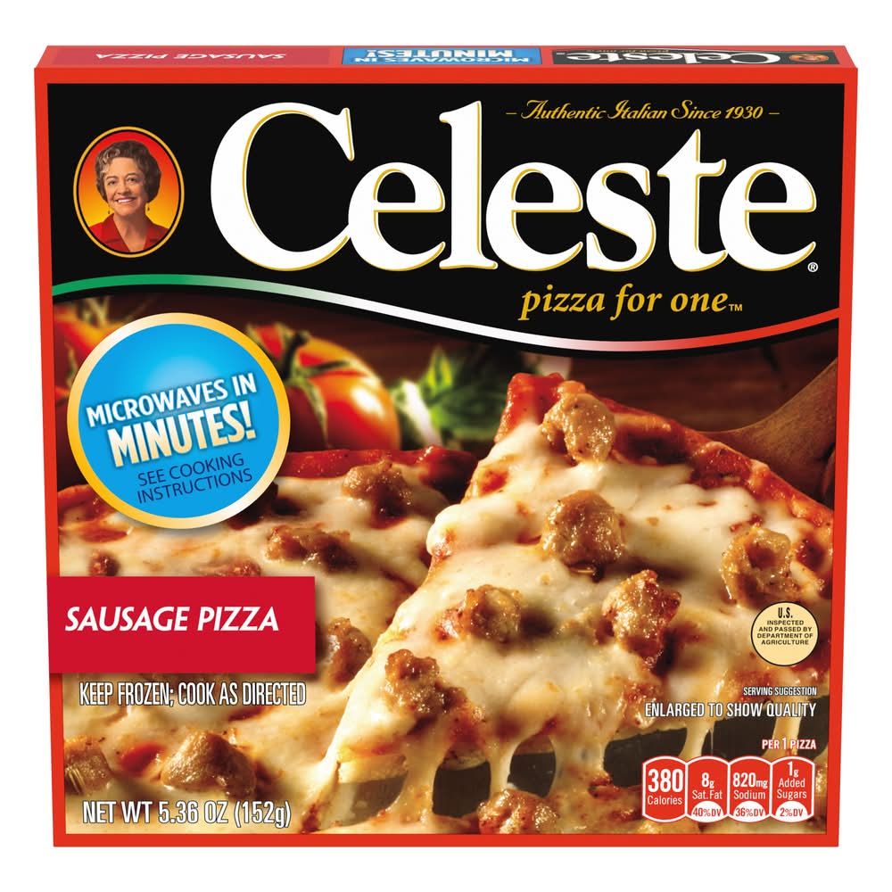When you are craving delicious sausage pizza, try Celeste Sausage Pizza for One, Individual Microwavable Frozen Pizza. Tasty thin crust, topped with savory sauce, gooey cheese and yummy sausage for homemade-quality pizza the whole family will love. This microwave meal cooks in 2 minutes so it is perfect for a quick lunch, dinner or anytime meal. Celeste: Authentic Italian Since 1930. Pinnacle Foods Group LLC, Cherry Hill ,NJ , 08003-3620