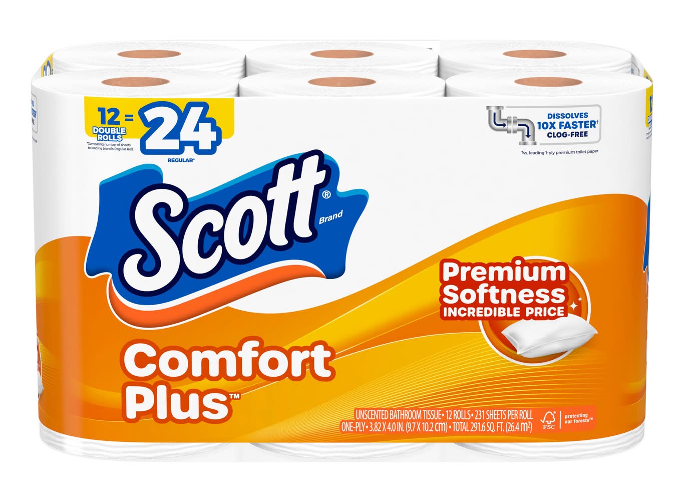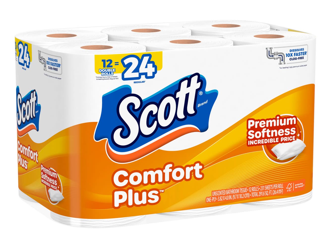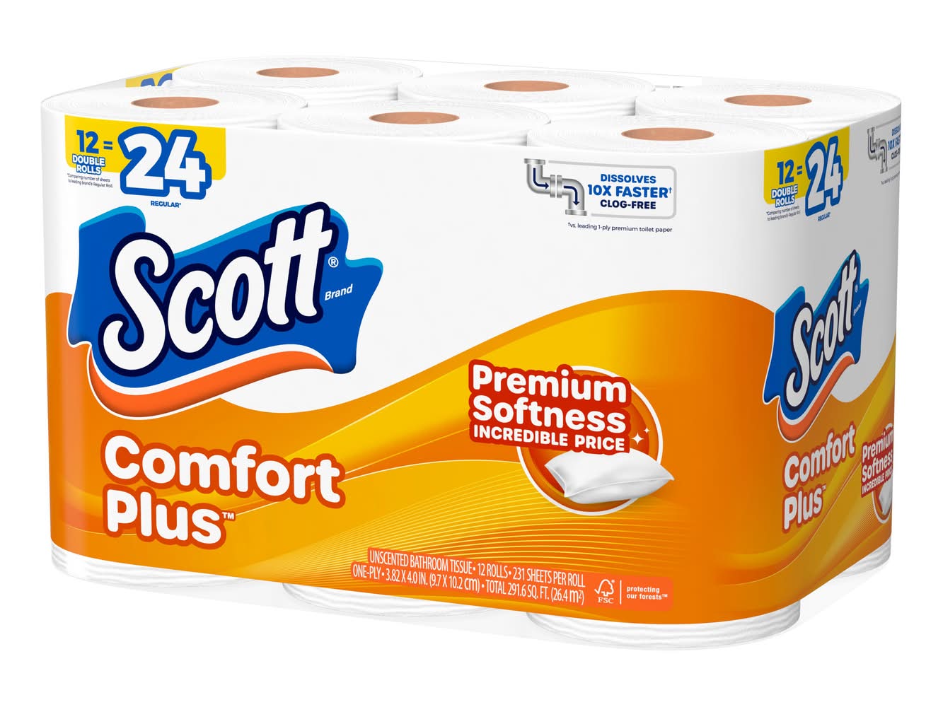 Scott Comfort Plus toilet paper rolls are 3x thicker and 4x stronger than the leading value brand. Our toilet tissue combines just the right amount of softness and strength by featuring thick and plush sheets. These toilet paper rolls are also trusted for flushability, as Scott Comfort Plus is septic-safe, sewer-safe, clog-free, and dissolves 10x faster. With Scott Comfort Plus 1-ply toilet paper, you get 12 Double Rolls of 231 sheets per roll. • Size: 3.82x4 in • Kimberly-Clark Global Sales, LLC, Neenah,WI,54956 • Packaging: Reusable