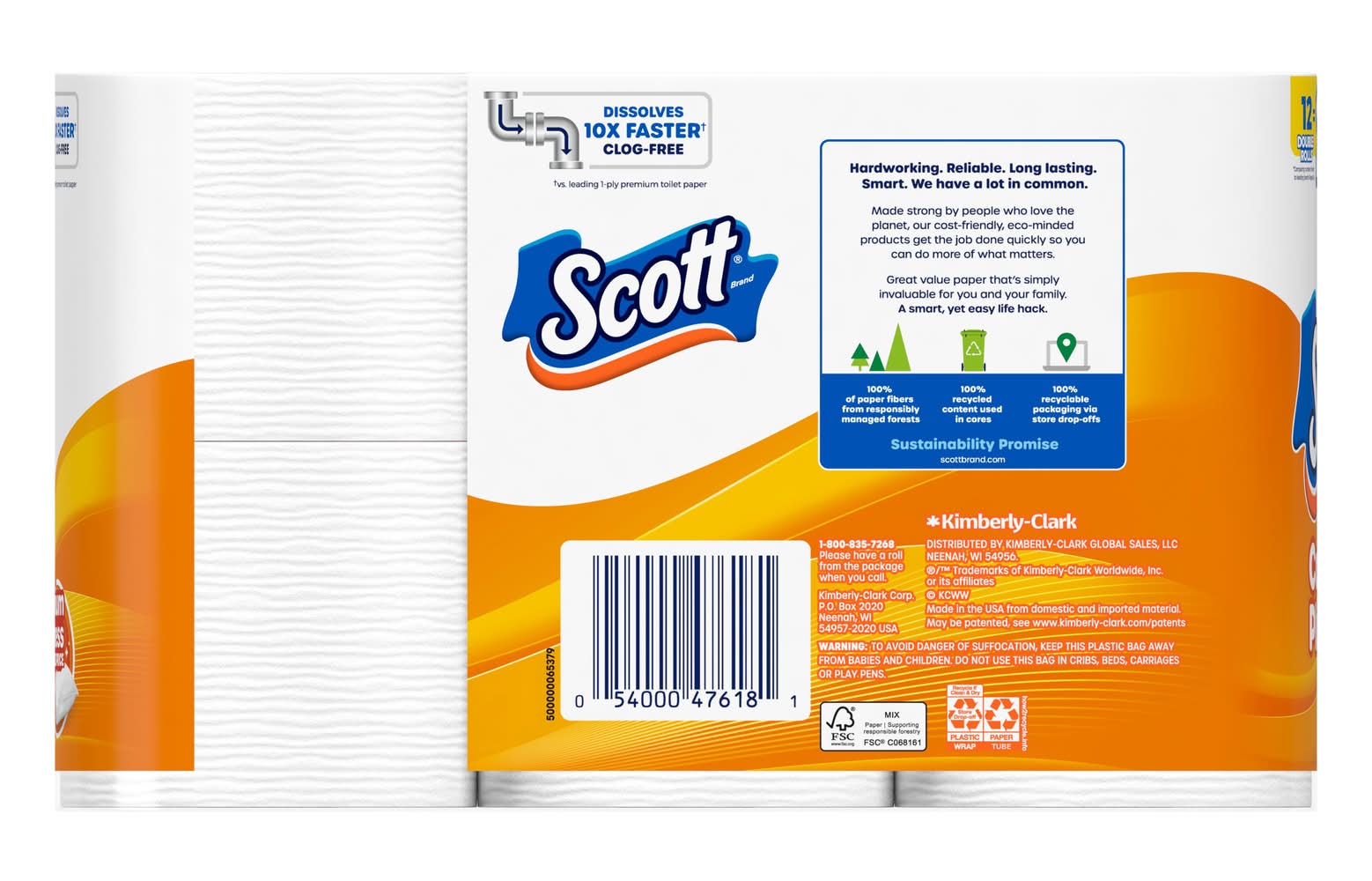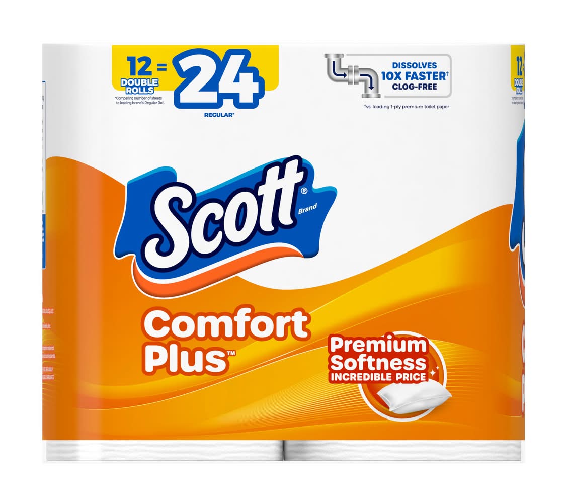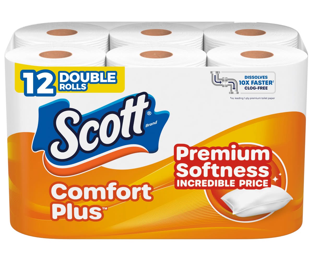 Scott Comfort Plus toilet paper rolls are 3x thicker and 4x stronger than the leading value brand. Our toilet tissue combines just the right amount of softness and strength by featuring thick and plush sheets. These toilet paper rolls are also trusted for flushability, as Scott Comfort Plus is septic-safe, sewer-safe, clog-free, and dissolves 10x faster. With Scott Comfort Plus 1-ply toilet paper, you get 12 Double Rolls of 231 sheets per roll. • Size: 3.82x4 in • Kimberly-Clark Global Sales, LLC, Neenah,WI,54956 • Packaging: Reusable