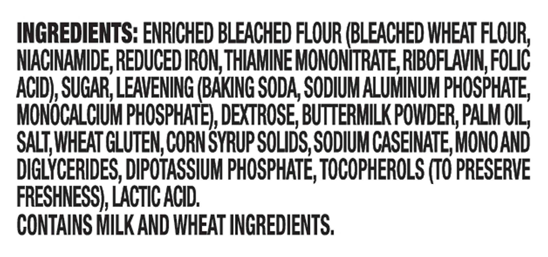 Ingredients: Enriched Bleached Flour (Bleached Wheat Flour, Niacinamide, Reduced Iron, Thiamine Mononitrate, Riboflavin, Folic Acid), Sugar, Leavening (Baking Soda, Sodium Aluminum Phosphate, Monocalcium Phosphate), Dextrose, Buttermilk Powder, Palm Oil, Salt, Wheat Gluten, Corn Syrup Solids, Sodium Caseinate, Mono and Diglycerides, Dipotassium Phosphate, Tocopherols (to Preserve Freshness), Lactic Acid Contains: Milk, Wheat, Gluten