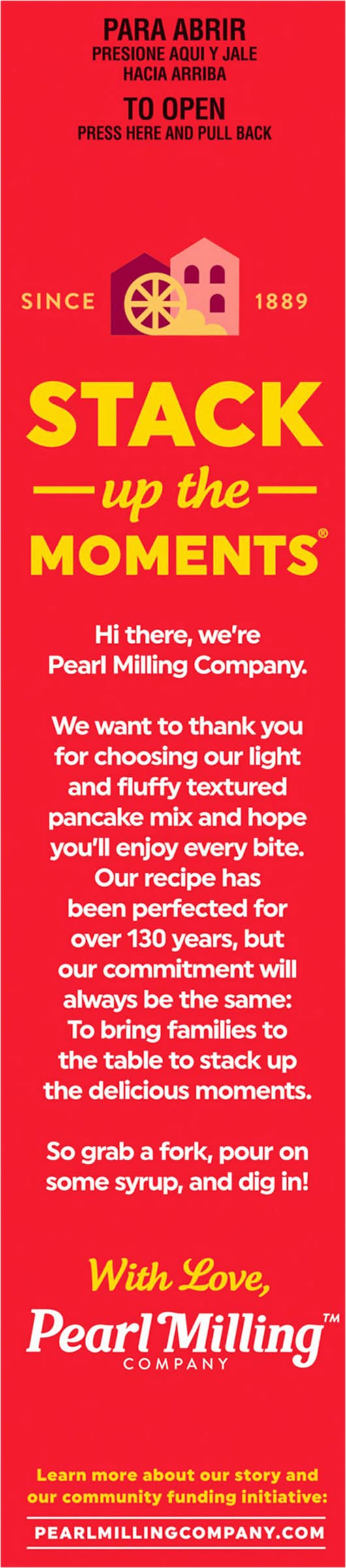 Pancake mix is made with raw flour so it is not ready-to-eat and must be thoroughly cooked before eating to prevent illness from bacteria in the flour. do not eat or play with raw dough; wash hands, utensils, and surfaces after handling. pancakes: makes 6 four-inch pancakes. 1 cup dry mix. 3/4 cup water. 1. heat skillet over medium-low heat or electric griddle to 375 degrees f. 2. combine all ingredients and stir until large lumps disappear (do not beat or over-mix). let stand 1-2 minutes to thicken. 3. pour slightly less than 1/4 cup batter for each pancake onto lightly greased skillet. tip: for golden brown pancakes, use solid shortening instead of oil, butter, or margarine. 4. cook for 90 seconds on first side. turn, and cook for another 60 seconds. tip: for soft and fluffy pancakes, avoid turning them more than once. waffles: heat waffle iron. combine 2 cups pearl milling company mix, 1-1/2 cups water and 1/3 cup oil; stir until large lumps disappear. for best results, allow batter to rest 4-5 minutes before baking. pour desired amount of batter into lightly greased waffle iron. bake until steaming stops. makes twelve 4 inch waffles. to open: press and pull back.