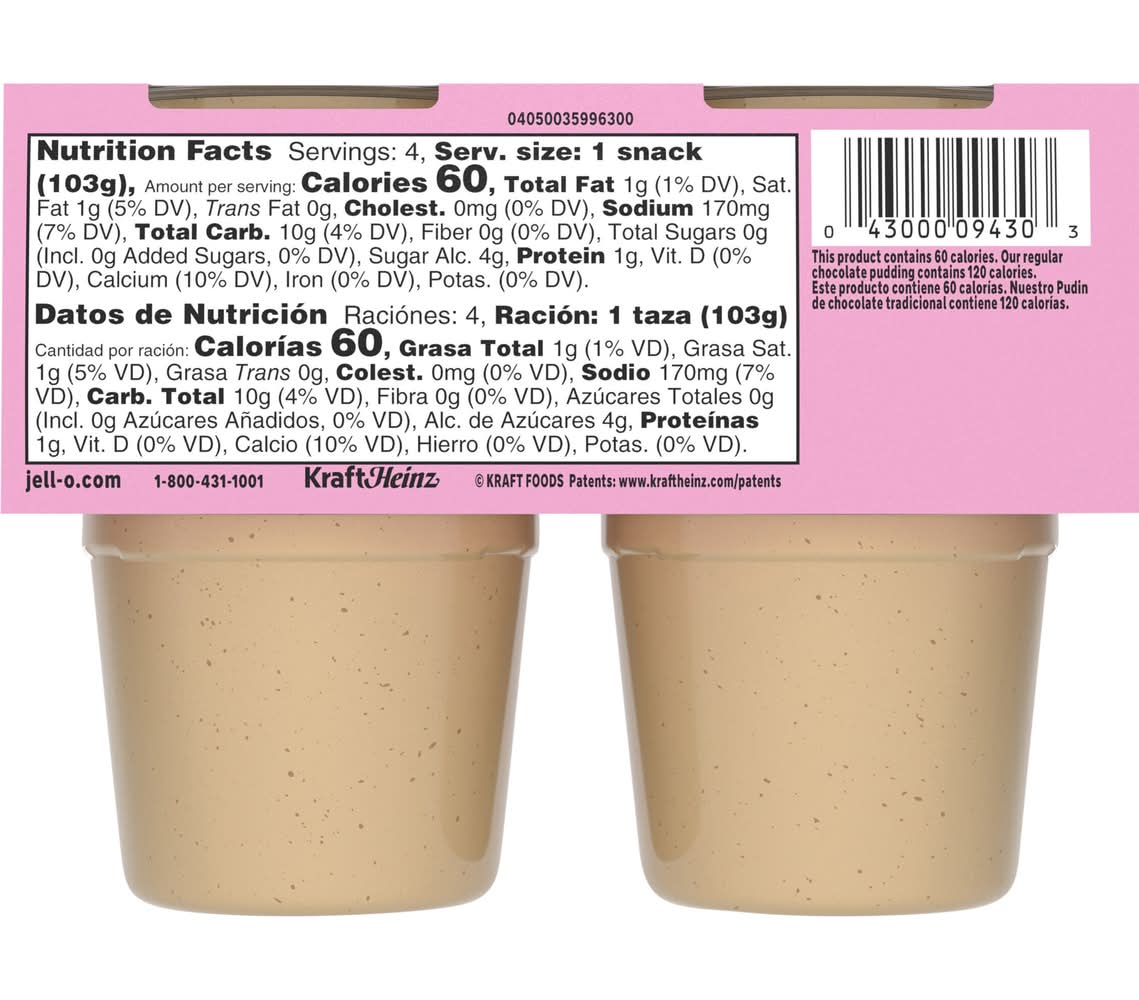 With other natural flavors. 60 calories per snack. This product contains 60 calories. Our regular chocolate pudding contains 120 calories. Zero sugar. Reduced calorie pudding snacks 50% fewer calories than our regular chocolate pudding.