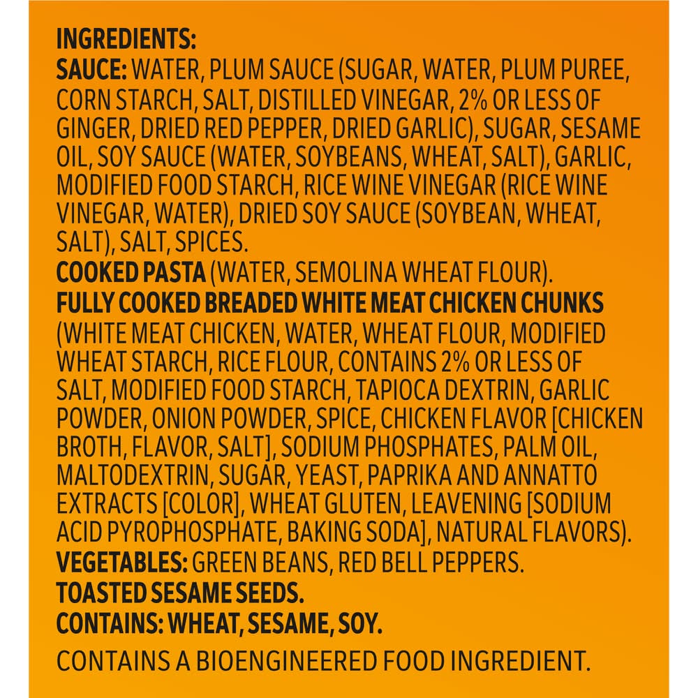 Ingredients: Cooked Pasta Water, Semolina Wheat Flour, Oven Fried Breaded Chicken Breast with Rib Meat Chicken Breast with Rib Meat, Wheat Flour, Water, Soybean Oil, Rice Flour, Modified Wheat Starch, 2% or Less of Modified Cornstarch, Salt, Tapioca Dextrin, Sugar, Modified Tapioca Starch, Wheat Gluten, Palm Oil, Leavening [Sodium Acid Pyrophosphate, Baking Soda], Garlic Powder, Onion Powder, Celery Seed, Maltodextrin, Natural Flavor, Sodium Phosphate, Chicken Flavor [Chicken Broth, Flavor, Salt], Yeast, Paprika and Annatto Extracts, Water, Green Beans, Plum Sauce Sugar, Water, Plum Puree, Cornstarch, Salt, Distilled Vinegar, 2% or Less of Ginger, Dried Red Pepper, Dried Garlic, Red Bell Peppers, 2% or Less of Sugar, Sesame Oil, Soy Sauce Water, Soybeans, Wheat, Salt, Garlic, Modified Cornstarch, Sesame Seeds, Rice Wine Vinegar Rice Wine Vinegar, Water, Dried Soy Sauce Soybeans, Salt, Wheat, Spice. Contains: Wheat, Soybeans, Corn, Gluten, Sesame