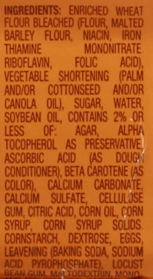 Ingredients: Enriched Wheat Flour Bleached (Flour, Malted Barley Flour, Niacin, Iron Thiamine Mononitrate Riboflavin, Folic Acid), Vegetable Shortening (Palm and/or Cottonseed and/or Canola Oil), Sugar, Water, Soybean Oil, Contains 2% or Less of: Agar, Alpha Tocopherol as Preservative, Ascorbic Acid (as Dough Conditioner), Beta Carotene (as Color), Calcium Carbonate, Calcium Sulfate, Cellulose Gum, Citric Acid, Corn Oil, Corn Syrup, Corn Syrup Solids, Cornstarch, Dextrose, Eggs, Leavening (Baking Soda, Sodium Acid Pyrophosphate), Locust Bean Gum, Maltodextrin, Mono and Diglycerides, Natural and Artificial Flavor, Salt, Sodium Stearoyl Lactylate, Soy Flour, Soy Lecithin, Whey, Yeast Contains: Wheat, Milk, Soybeans, Eggs