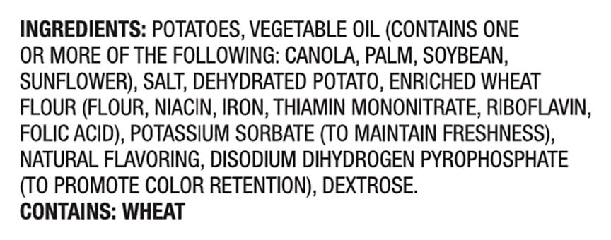 Ingredients: Potatoes, Vegetable Oil (Contains One or More of the Following: Canola, Palm, Soybean, Sunflower), Salt, Dehydrated Potato, Enriched Wheat Flour (Flour, Niacin, Iron, Thiamin Mononitrate, Riboflavin, Folic Acid), Potassium Sorbate (to Maintain Freshness), Natural Flavoring, Disodium Dihydrogen Pyrophosphate (to Promote Color Retention), Dextrose Contains: Wheat, Soybeans
