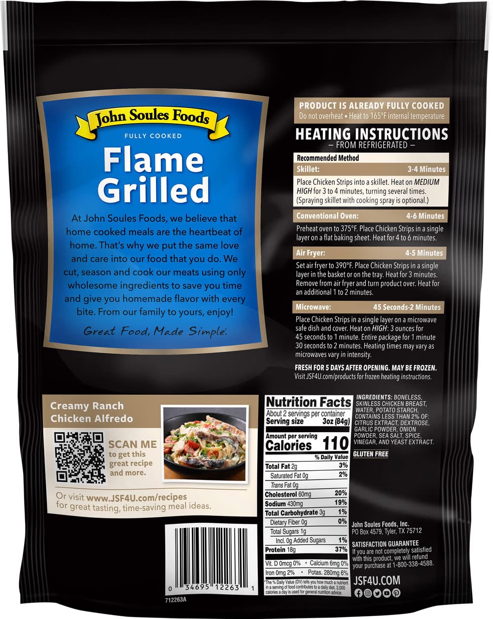 Excellent source of protein. Fully cooked. 100% All natural (No artificial ingredients. Minimally processed). Chicken raised with no added hormones or steroids (Federal regulations prohibit the use of hormones or steroids in poultry). Thick juicy breast strips. Flame grilled. A John Soules Foods, we believe that home-cooked meals are the heartbeat of home. That's why we put the same love and care into our food that you do. We cut, season and cook our meats using only wholesome ingredients to save you time and give you homemade flavor with every bite. From our family to yours, enjoy! Great food, made simple. Creamy ranch chicken alfredo. • Number of servings: 2 • John Soules Foods, Inc., Tyler, TX, 75712