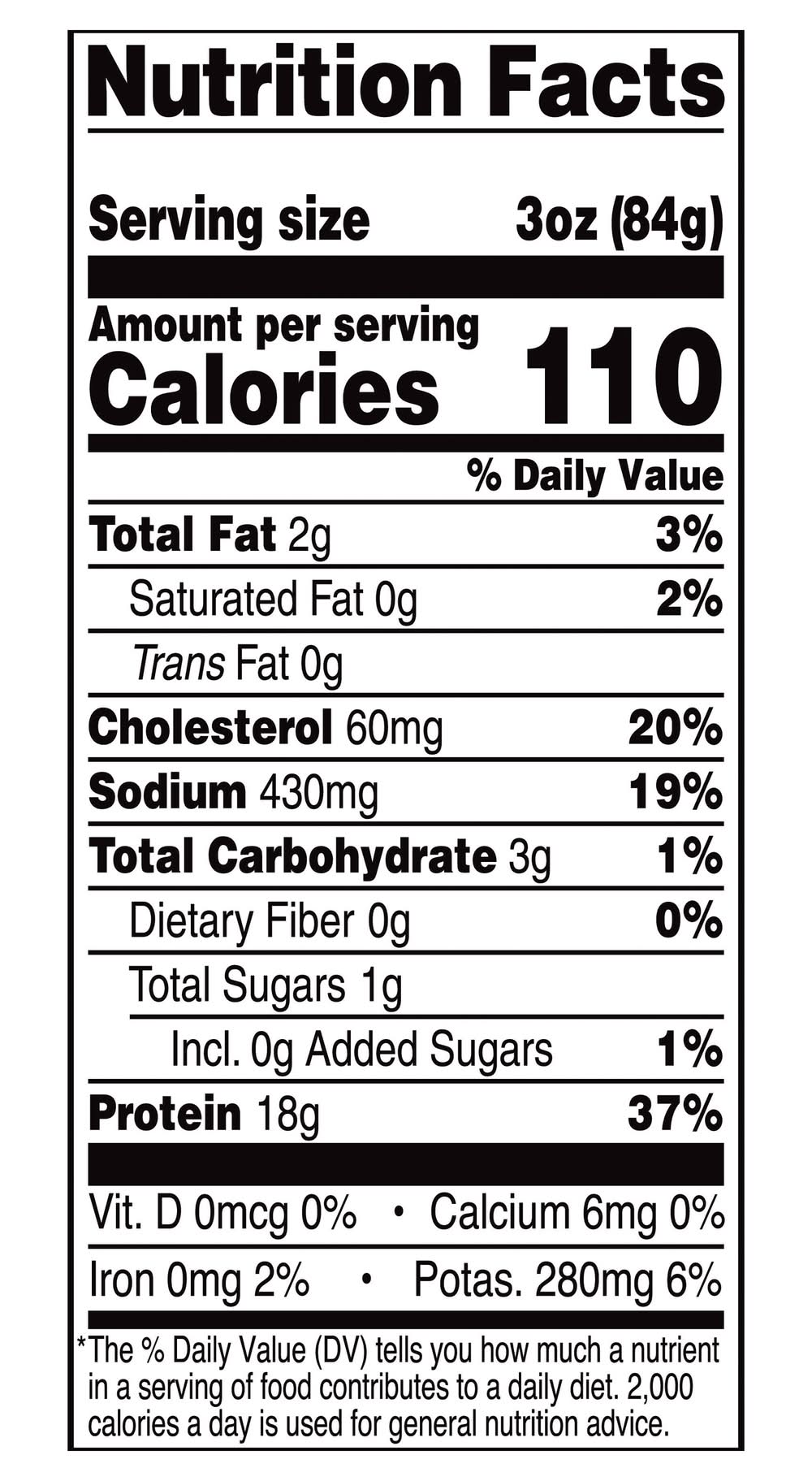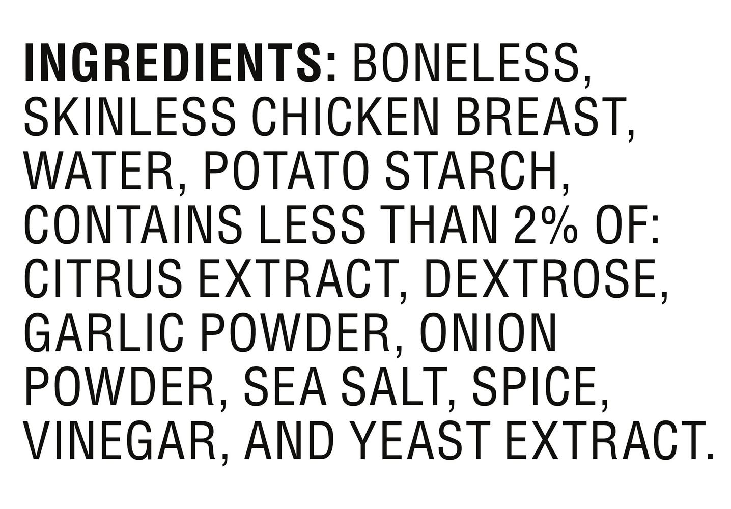 Ingredients: Boneless, Skinless Chicken Breast, Water, Potato Starch, Contains Less than 2% of: Citrus Extract, Dextrose, Garlic Powder, Onion Powder, Sea Salt, Spice, Vinegar, and Yeast Extract