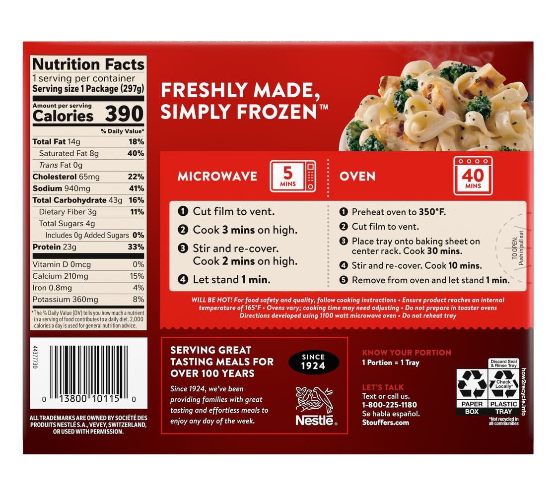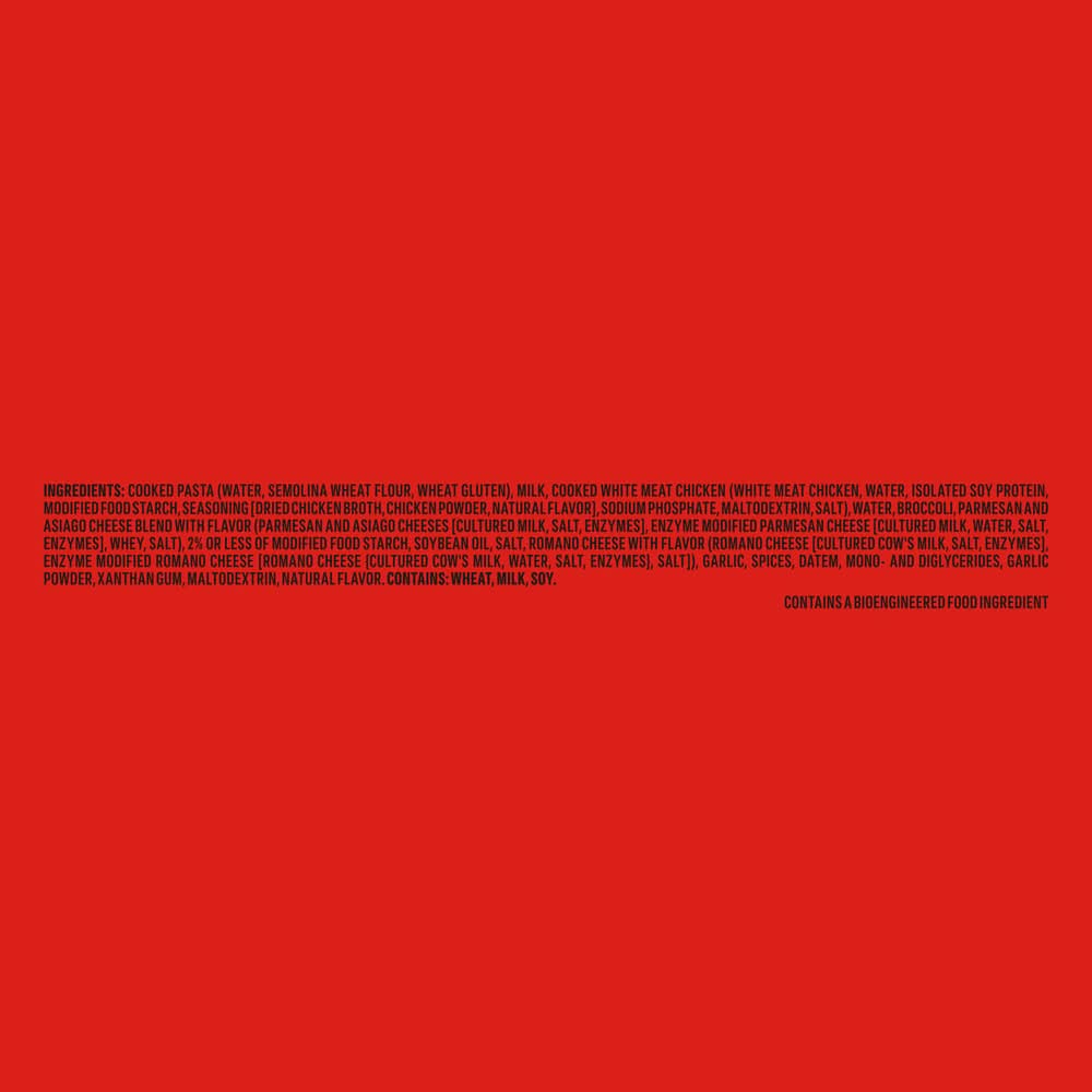 Ingredients: Cooked Pasta (Water, Semolina Wheat Flour, Wheat Gluten), Milk, Cooked White Meat Chicken (White Meat Chicken, Water, Isolated Soy Protein, Modified Food Starch, Seasoning [Dried Chicken Broth, Chicken Powder, Natural Flavor], Sodium Phosphate, Maltodextrin, Salt), Water, Broccoli, Parmesan and Asiago Cheese Blend with Flavor (Parmesan and Asiago Cheeses [Cultured Milk, Salt, Enzymes], Enzyme Modified Parmesan Cheese [Cultured Milk, Water, Salt, Enzymes], Whey, Salt), 2% or Less of Modified Food Starch, Soybean Oil, Salt, Romano Cheese with Flavor (Romano Cheese [Cultured Cow's Milk, Salt, Enzymes], Enzyme Modified Romano Cheese [Romano Cheese {Cultured Cow's Milk, Water, Salt, Enzymes}, Salt]), Garlic, Spices, DATEM, Mono- and Diglycerides, Garlic Powder, Xanthan Gum, Maltodextrin, Natural Flavor Contains: Wheat, Milk, Soybeans, Gluten
